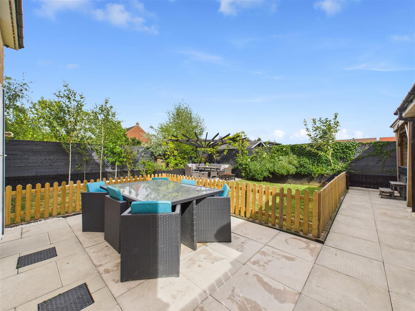 Outside - The property occupies a corner plot provides extensive parking for up to six vehicles, leading to a detached garage. There is also an EV charger installed. The beautifully landscaped rear garden is a serene oasis, featuring a patio area with a lawn, a second patio with a pergola, and raised planters with a tranquil water feature. A dedicated space behind the garage is perfect for a hot tub. The hot tub and pergola in situ may be available by separate negotiation.