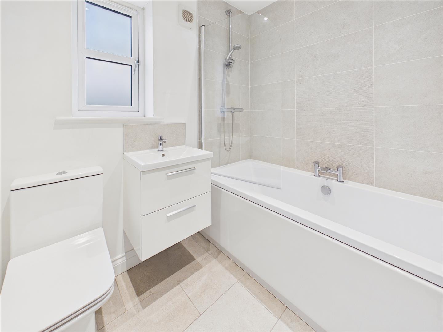 Bathroom - With stylish white suite comprising of low level WC, wash hand basin with drawers, panelled bath with shower over and screen, contemporary tiling to the walls and floors, heated towel rail.