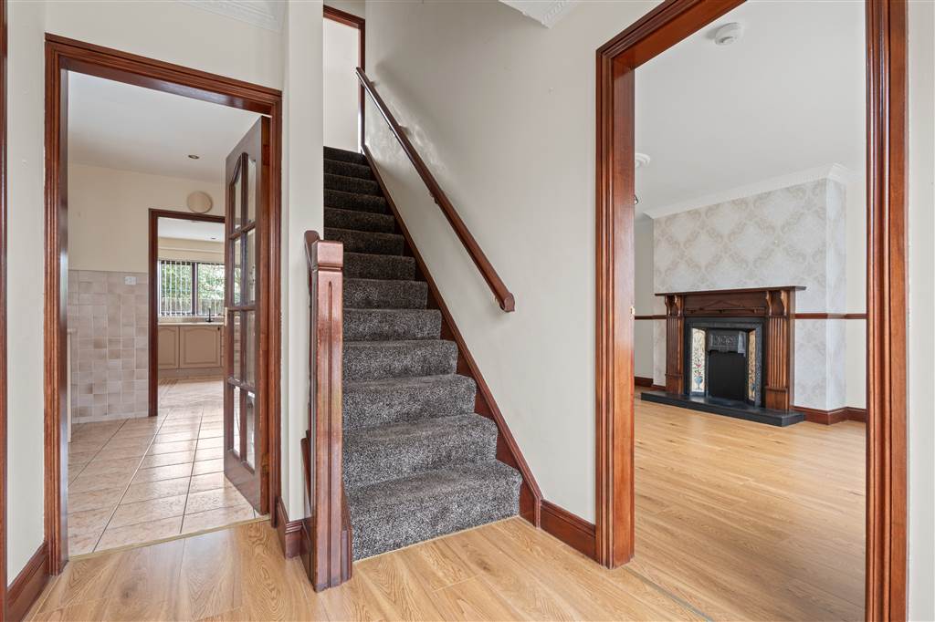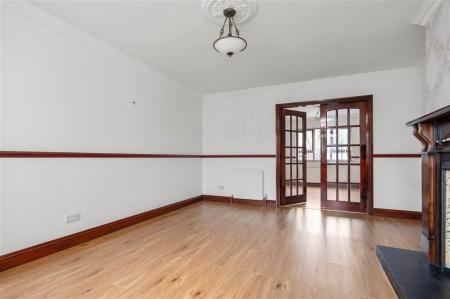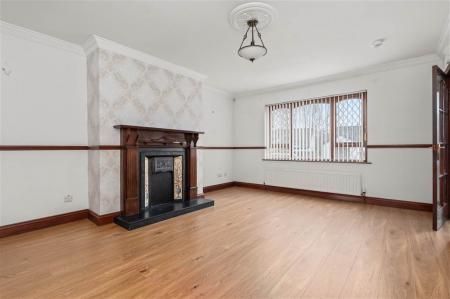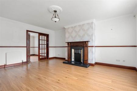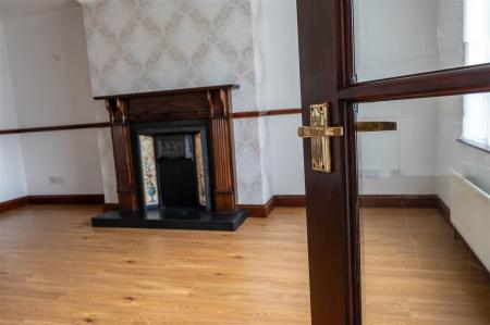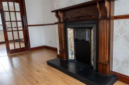 - Living room with cast-iron fireplace (currently boarded up)