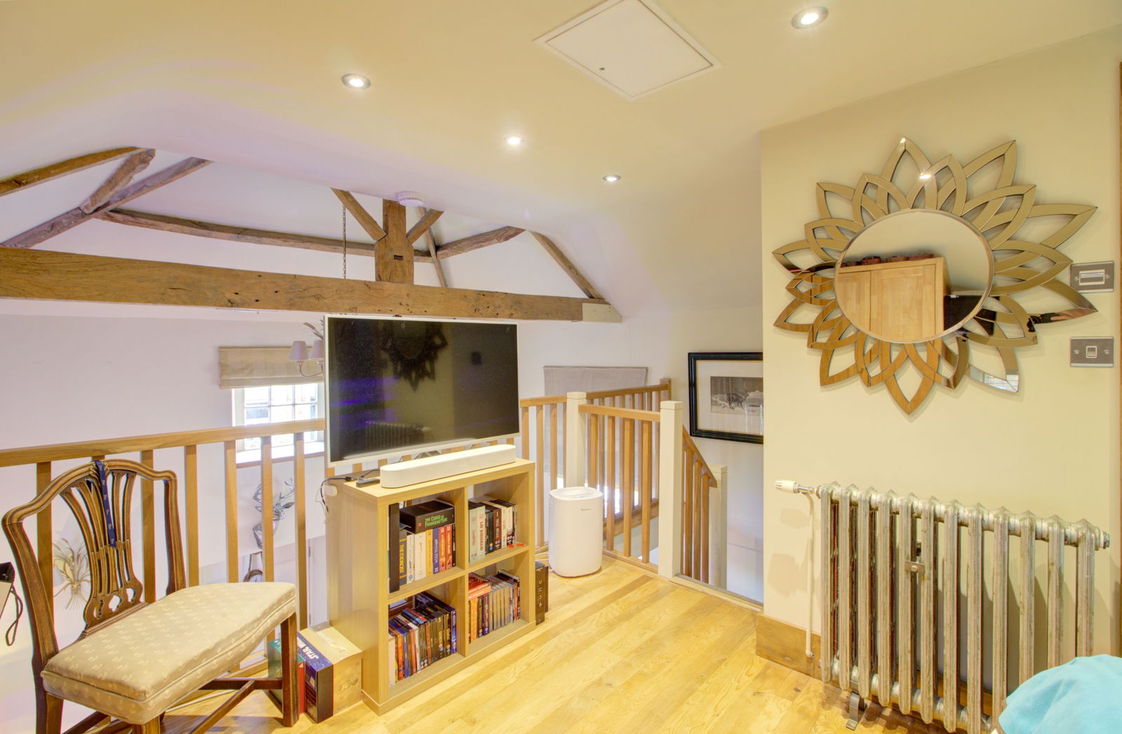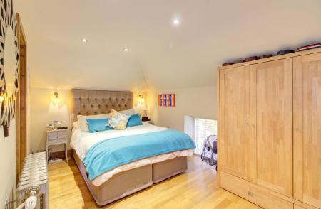 A staircase from the sitting room to the mezzanine level gives access to the master bedroom which measures 14’ 4” x 8’ 11”. The master bedroom enjoys a good-level of head-height with views over the ground floor accommodation below. Accessible from the bedroom is an ensuite shower room which comprises of a modern white and walk-in shower.