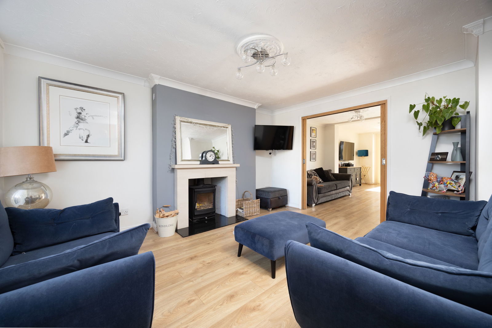As you enter the property a central entrance hall gives access to the ground floor accommodation and staircase to the first floor. Overlooking the front aspect is the formal sitting room which enjoys natural light throughout the day courtesy of the southerly aspect. Measuring 14’ x 12’, the sitting room provides ample space for all the family and benefits from a feature Bath stone fireplace with working wood-burner as well as double doors that open up to the dining room to the rear.