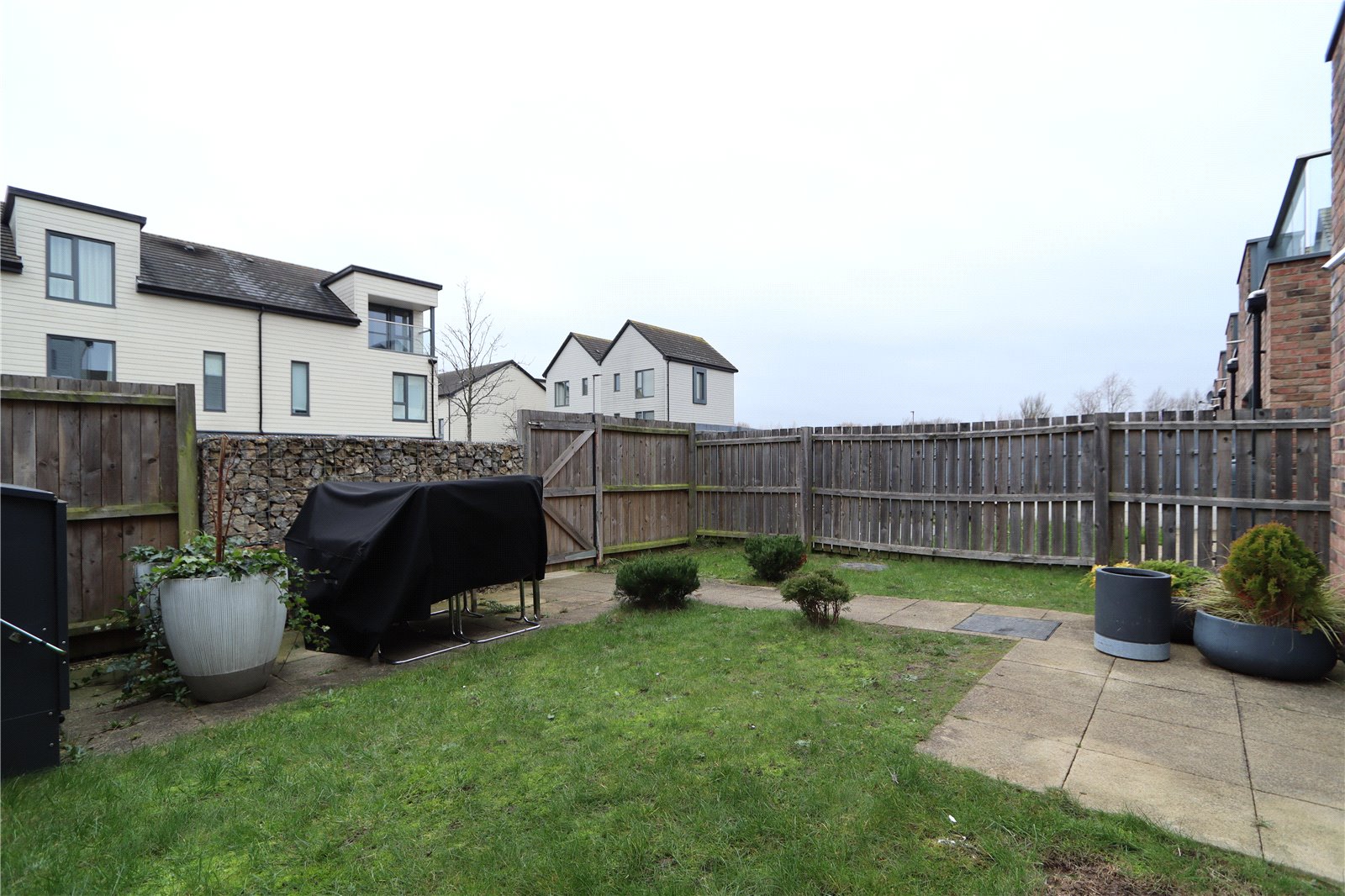 At the front, the property features a lawned garden with a pathway leading to the entrance. The enclosed rear and side garden includes a patio, lawn, and gated access to a parking area for two vehicles.