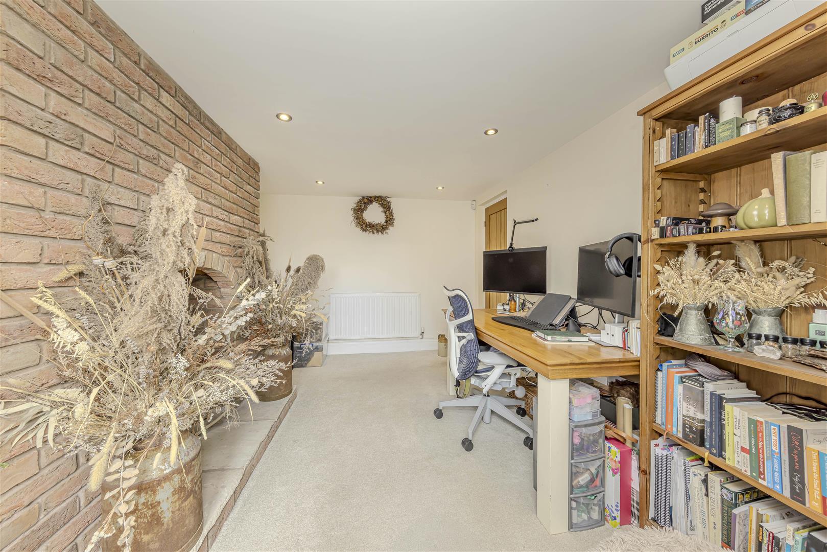 The inviting living room enjoys natural light from windows on three sides, creating a bright and airy feel. A charming log burner with a stone surround adds character and warmth. A second reception room, complete with an exposed brick chimney breast, provides versatility as a home office, playroom, or snug.