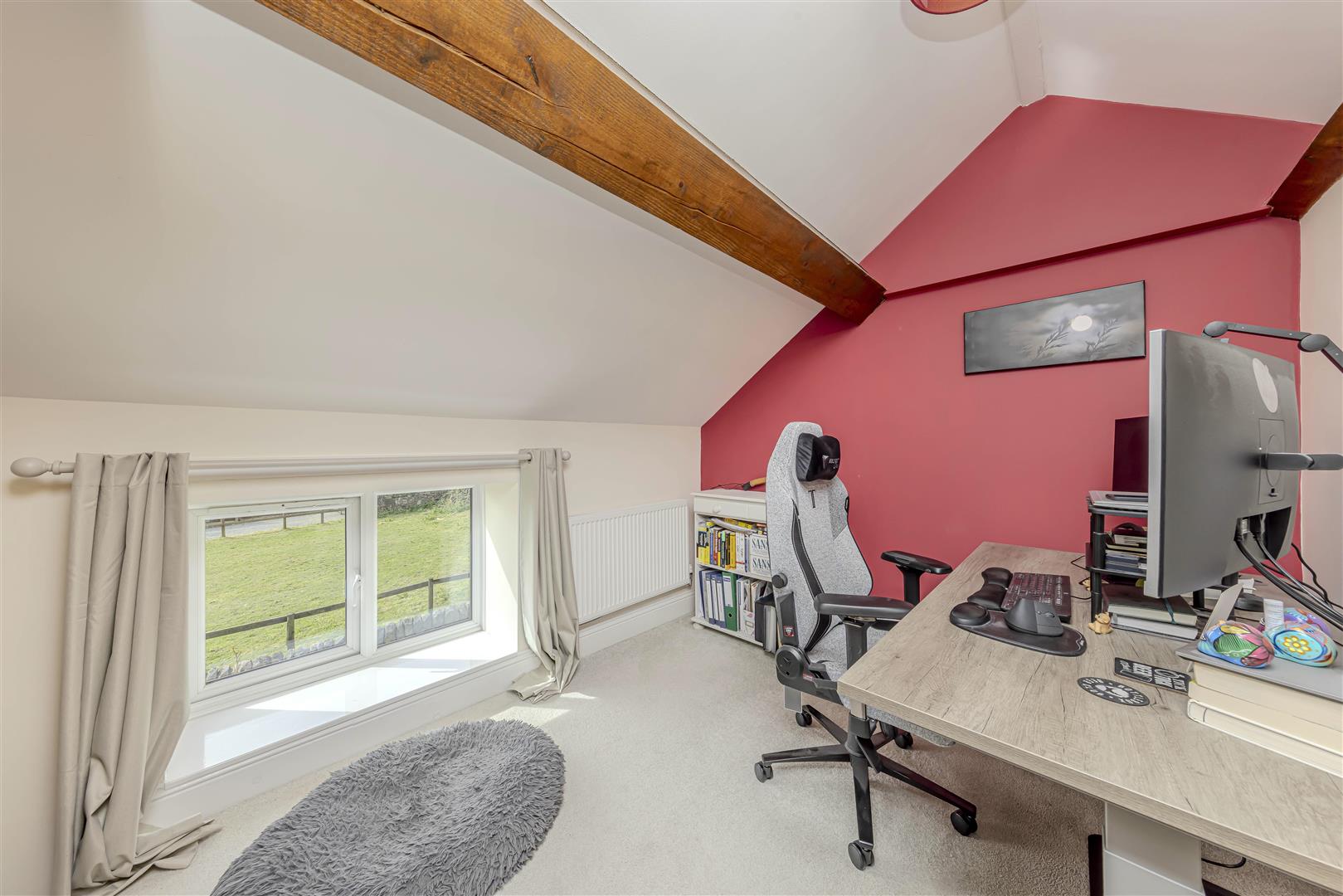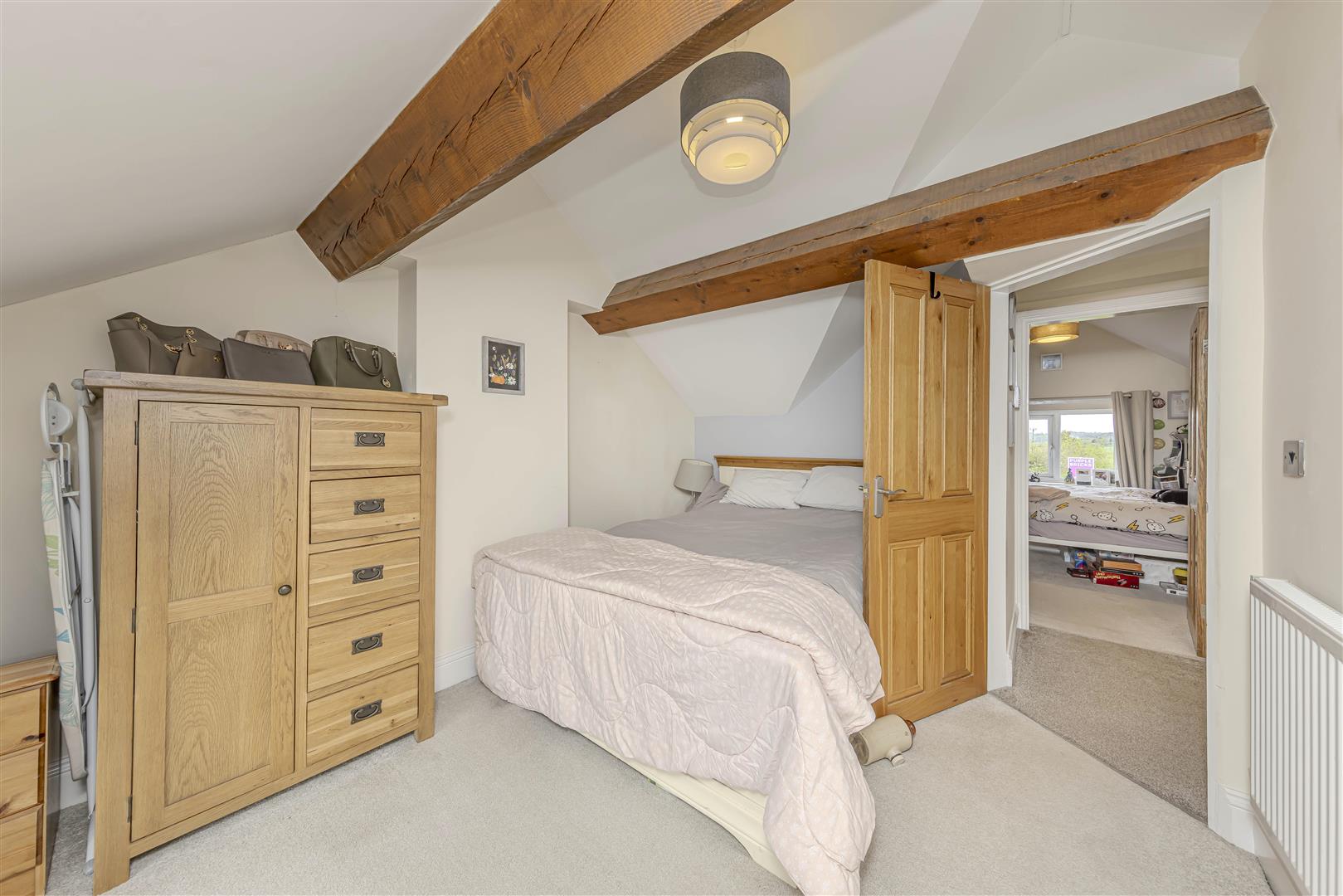 Upstairs, the property boasts four well-proportioned bedrooms. The principal bedroom benefits from a stylish ensuite shower room, while the remaining three bedrooms feature charming pitched ceilings-two with exposed beams that highlight the home's rustic character. A large family bathroom with a freestanding roll-top bath serves the remaining bedrooms, providing a perfect place to unwind.
