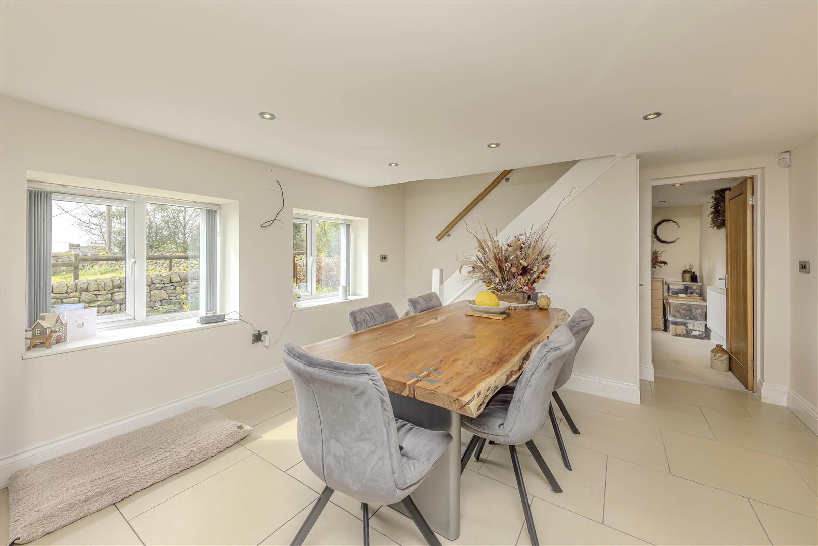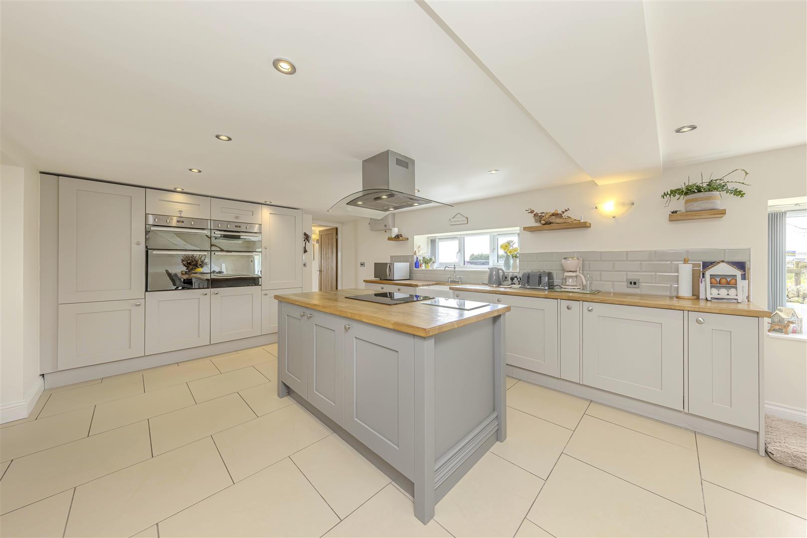 Kitchen Diner - 9.33 x 3.94 max (30'7" x 12'11" max ) - Tiled flooring. Wall mounted radiators. UPVC double glazed windows to the side aspect. A range of shaker style wall and base units with wooden work surfaces above. Integrated Hotpoint ovens, dishwasher, and fridge. Space for American style fridge freezer. Island with storage underneath and wooden work surfaces. Stoves induction hob. Sink unit with mixer tap above. Access to living room. Access to sunroom. Access to office. Stairs to first floor accommodation. Wall lights. Inset spotlights.