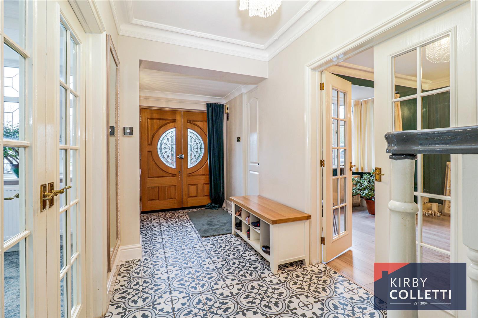 Entrance Hall - Stairs to first floor. Understairs storage cupboard housing fuse board. Cloaks cupboard. Radiator. Tiled floor. Double doors to: