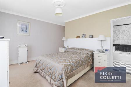 En Suite Bathroom/W.C - 2.13m x 2.03m (7 x 6'8) - Side aspect uPVC double glazed window. Fully tiled walls and floor. Panel enclosed bath with mixer tap and shower attachment. Low level W.C. Inset sink with marble plinth.