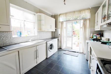 Range of base and wall units with roll top work surfaces, ceramic sink, space for fridge freezer, plumbing for washing machine, window to rear aspect, Access door to Garden.