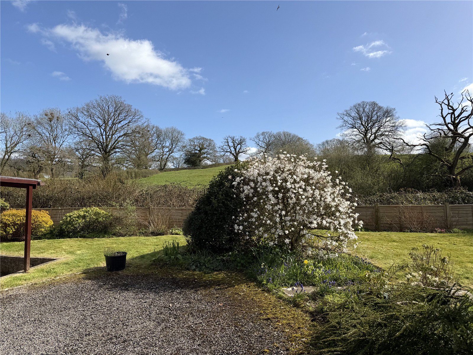 Outside, Scotts Retreat enjoys an elevated position, with the front garden sloping down to a mature laurel hedge. The driveway provides ample parking for several cars and leads to a detached garage with an adjoining car port.