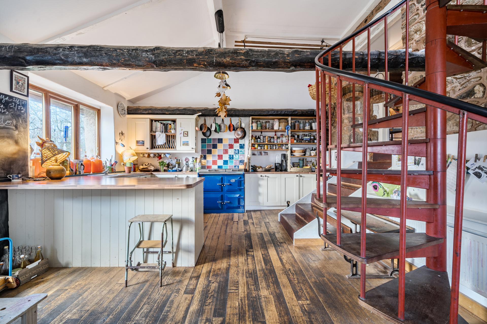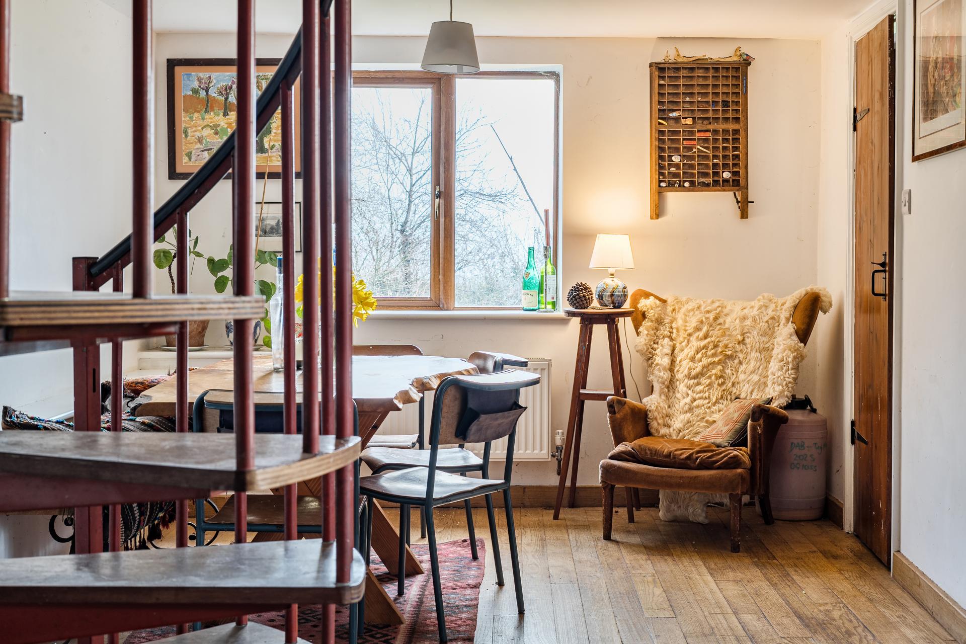 Off the kitchen is a useful walk-in utility space, providing additional storage and laundry facilities, alongside a ground floor shower room - an excellent practical addition for family life or visiting guests. A door from the kitchen opens directly onto the rear patio, creating an easy connection between indoor and outdoor living. A spiral staircase rises from the kitchen to the mezzanine level, where an additional bedroom has been created - ideal for guests, teenagers or creative use.