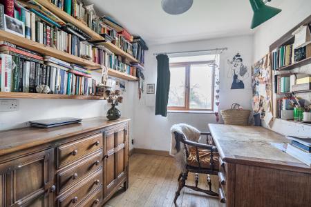 This is a room that feels warm and settled, particularly on cooler evenings when the fire is lit, yet equally light and welcoming by day. A separate study sits just off the living space, providing a quiet and well-proportioned room for home working or reading away from the main flow of the house.