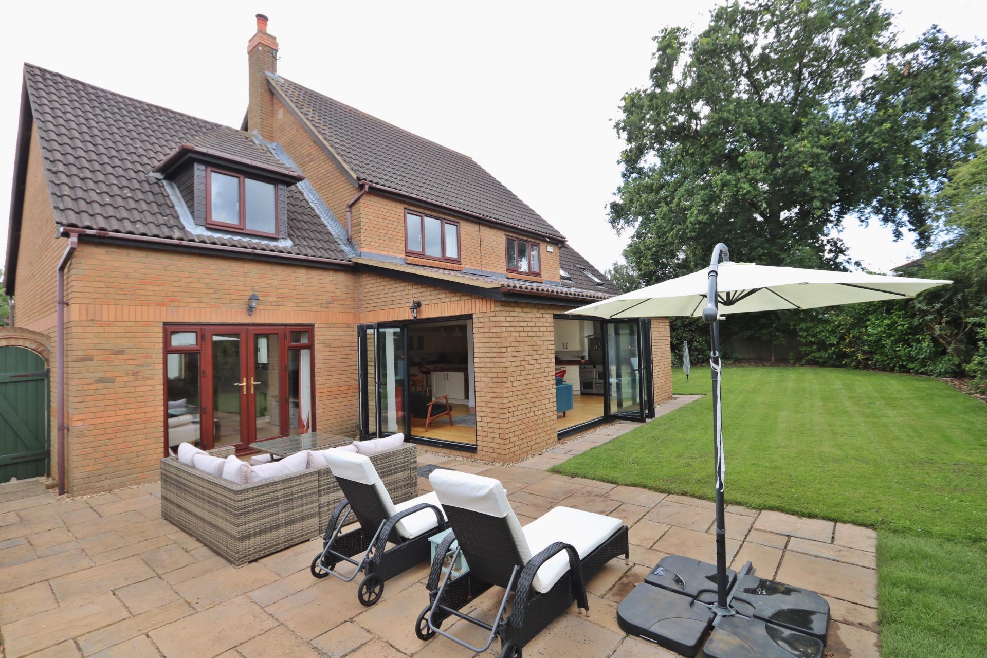 Brief internal accommodation comprises; an entrance porch, grand entrance lobby, guest cloakroom, study, dual aspect living, a beautifully extended 27ft kitchen/diner with vaulted ceilings, velux windows, integrated appliances and garden views view two lots of bi-folding doors. There is a separate utility room and a large family room which was the former integral double garage. To the first floor there is a spacious gallery landing, family bathroom, five generous and well proportioned bedrooms, four of which have built in wardrobes and the master benefiting from an en-suite and walk in wardrobe/dressing area. Externally the property boasts a healthy sized private rear garden with lawn, patio and mature trees. To the front there is a large stone driveway for up to five vehicles and a double garage with electric roller doors.