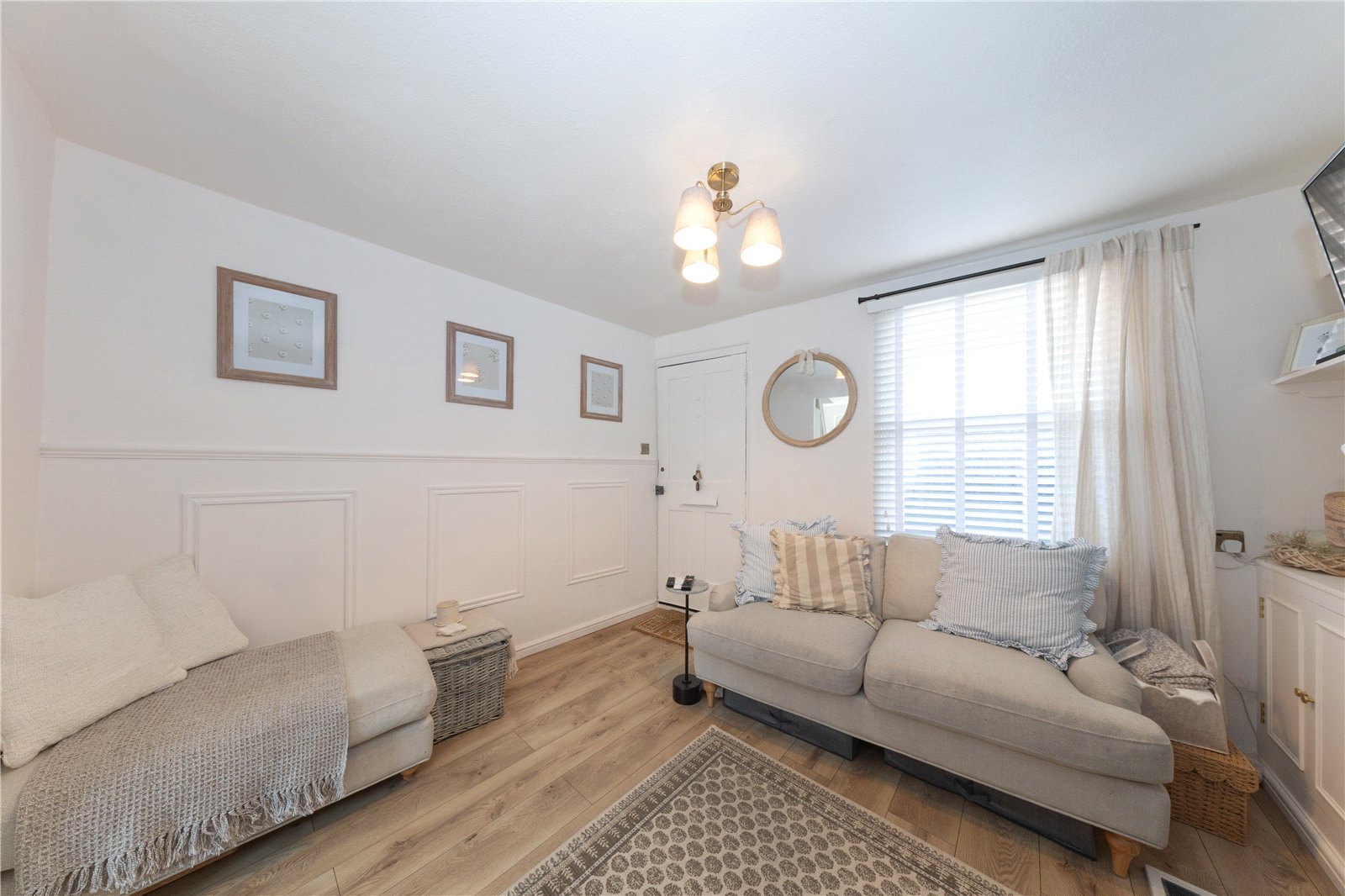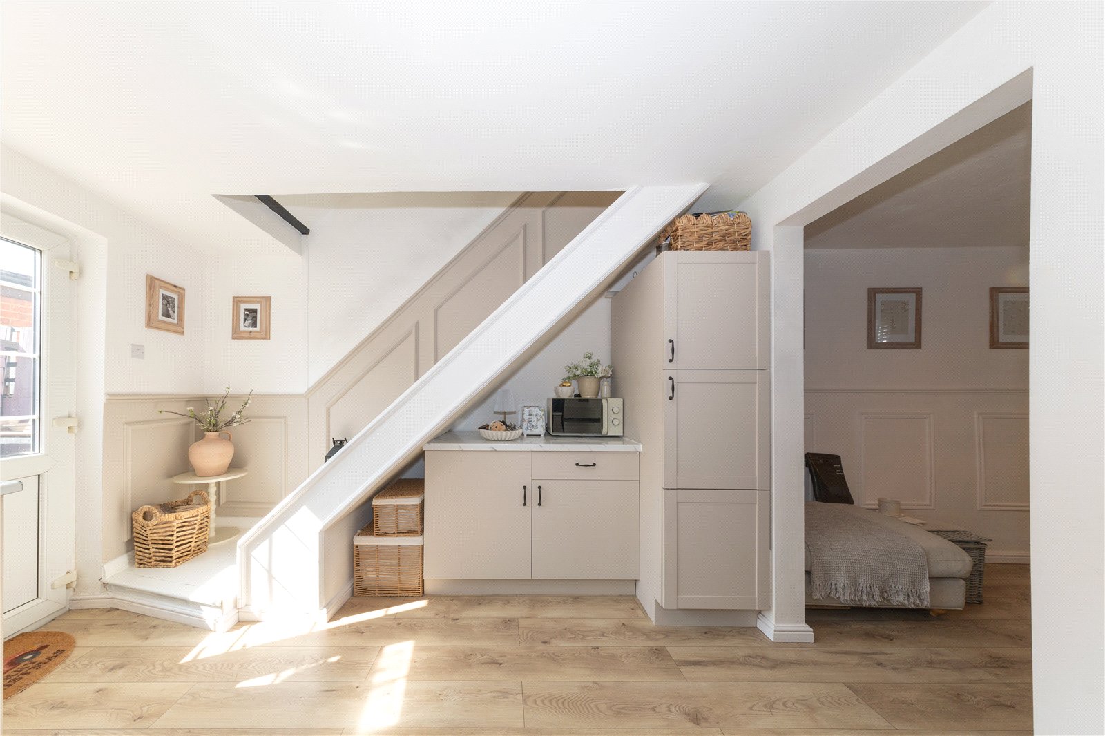 Internally, this delightful home offers a cosy lounge featuring a beautiful log burner, with built-in storage units either side, creating a warm and inviting atmosphere. The lounge flows seamlessly into the recently refurbished kitchen, which boasts custom-fitted cabinets, stylish new flooring, and a brand-new combi boiler. From the kitchen, you’ll find access to the south-facing garden, which is a fantastic low-maintenance space. It features a paved patio area, ideal for outdoor seating, and includes side access leading to the front of the property.