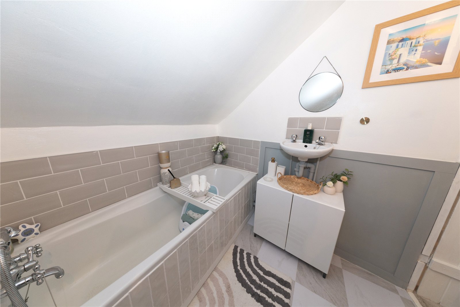 On the first floor, a small landing leads to Bedroom 2, which benefits from built-in wardrobes and space for a double bed. The modern bathroom has been completely renovated and now includes a walk-in shower, toilet, and a stylish vanity sink. Off the landing, there’s an additional room currently used as a dressing room, but with flexible potential for use as a home office or study.