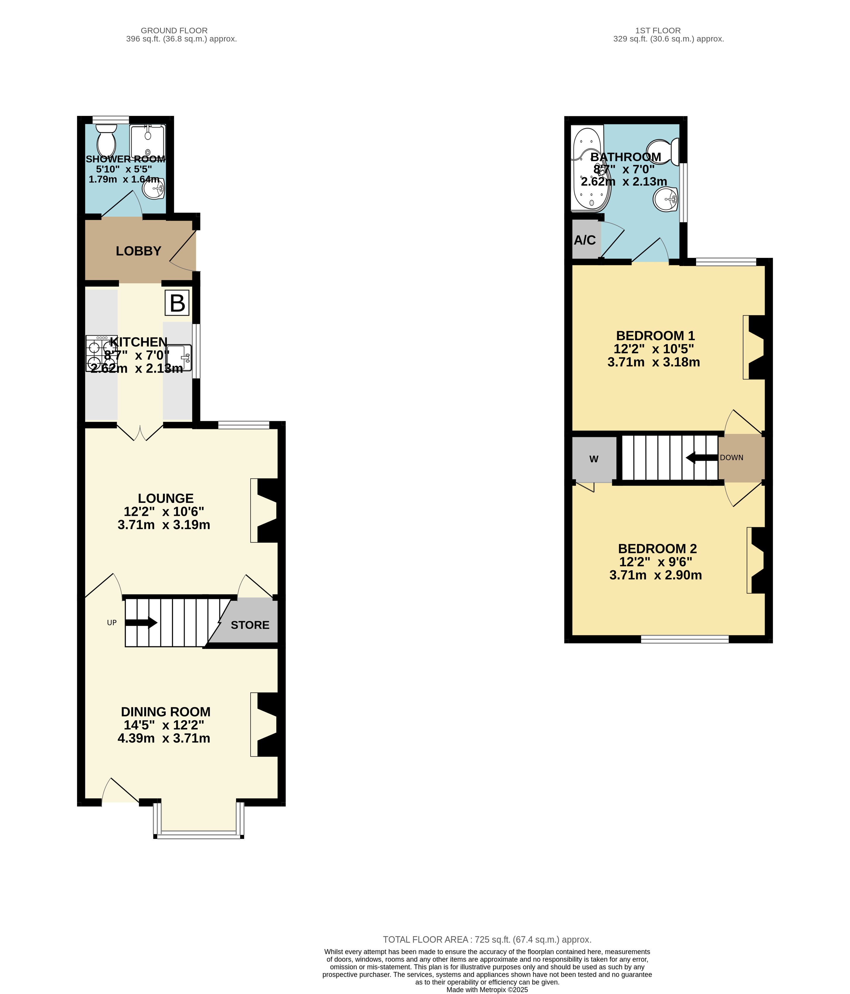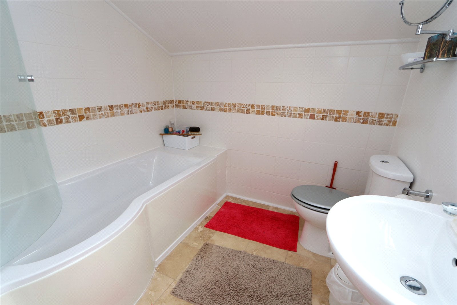 Upstairs offers two generous double bedrooms. Bedroom One benefits from ample space for wardrobes and includes a private en-suite bathroom with bath, WC, basin and a large built-in storage cupboard. Bedroom Two is another well-proportioned double, featuring a built-in wardrobe and character fireplace.