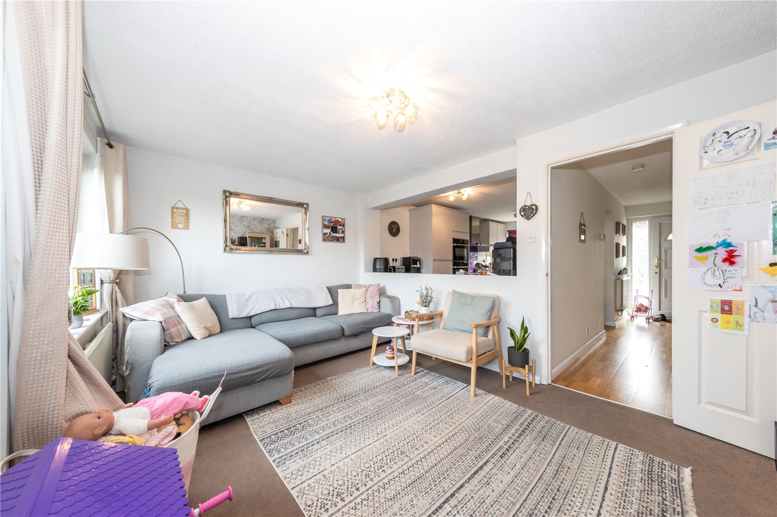 Internally, the home opens into a welcoming entrance hall with convenient space for coats and shoes. To the front is a modern kitchen/diner, refurbished in 2017 and fitted with integrated appliances including a fridge/freezer, Neff oven, Neff hob, and dishwasher. There is also space for a washing machine. The kitchen features a stylish breakfast bar and space for a dining table, making it a great spot for everyday meals and entertaining. A combi boiler, neatly housed in a kitchen cupboard, was newly installed in 2019.
