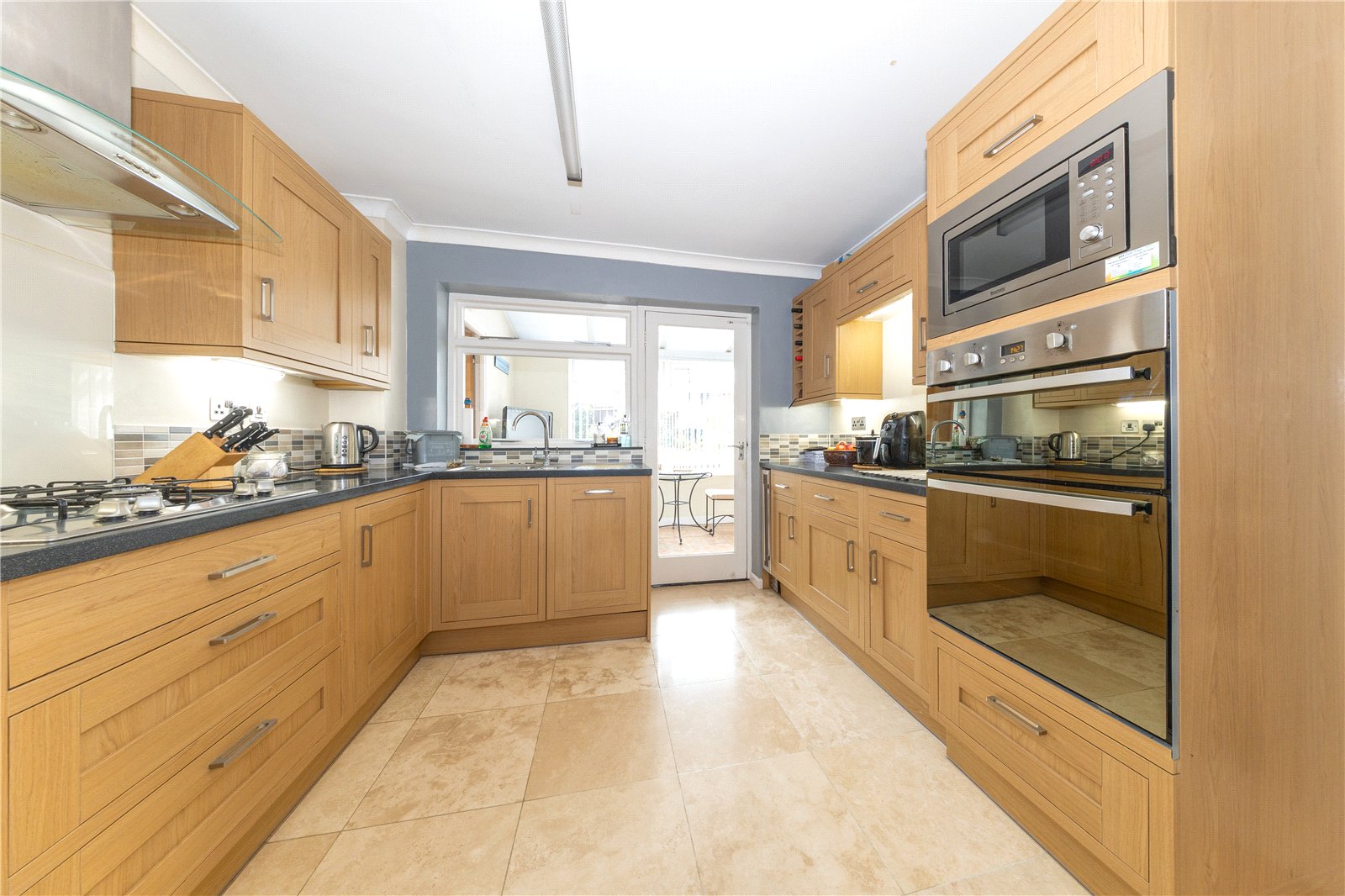 The kitchen is well-appointed with an array of integrated appliances, including a dishwasher, fridge, double oven, wine fridge, microwave, and hob while the adjoining conservatory offers a light-filled space for additional living space with views across the garden. A separate utility room adds to the practicality of the home, providing additional space for laundry and storage, and also gives access into the garage as well as a downstairs WC including a toilet and sink.