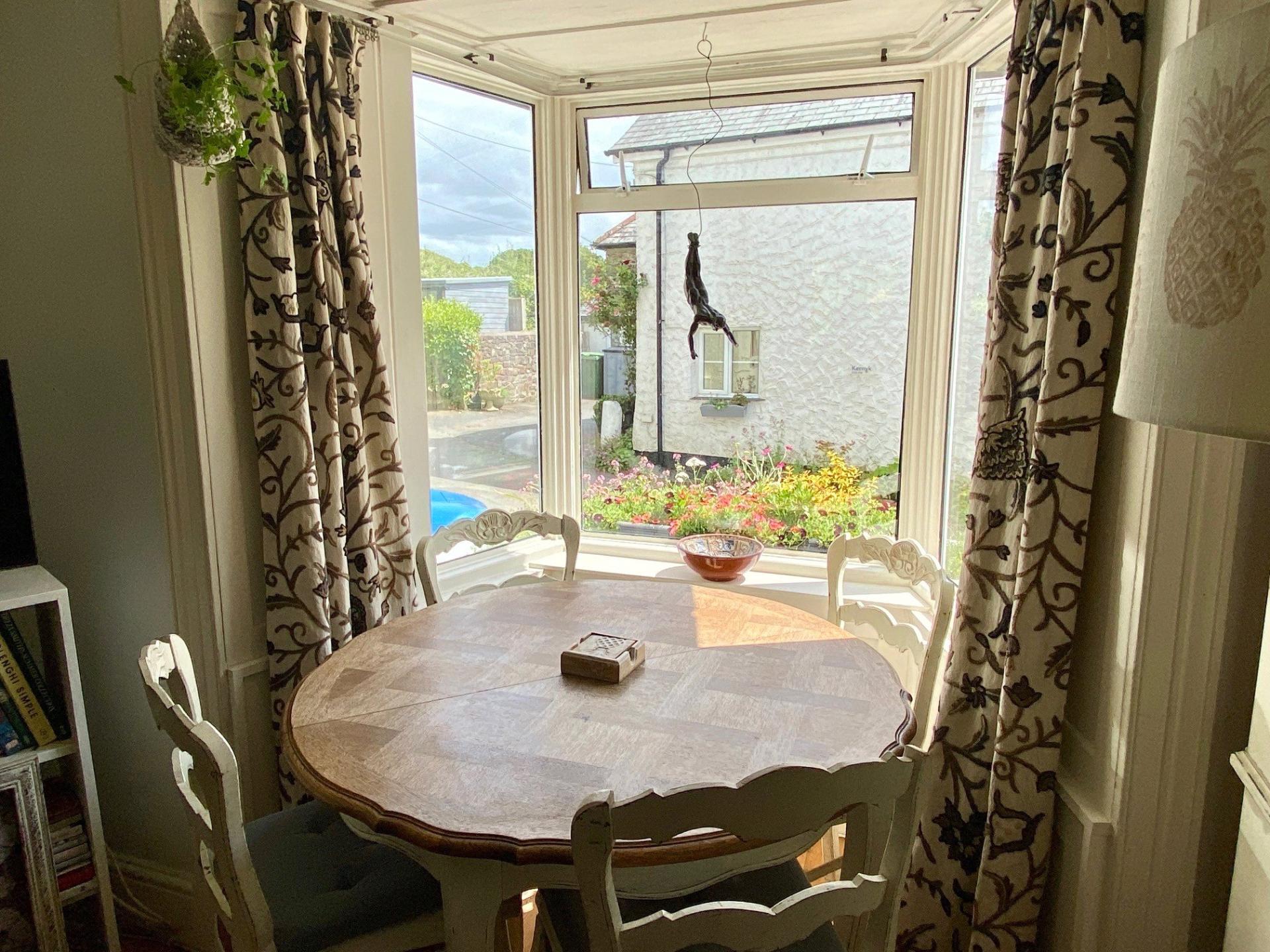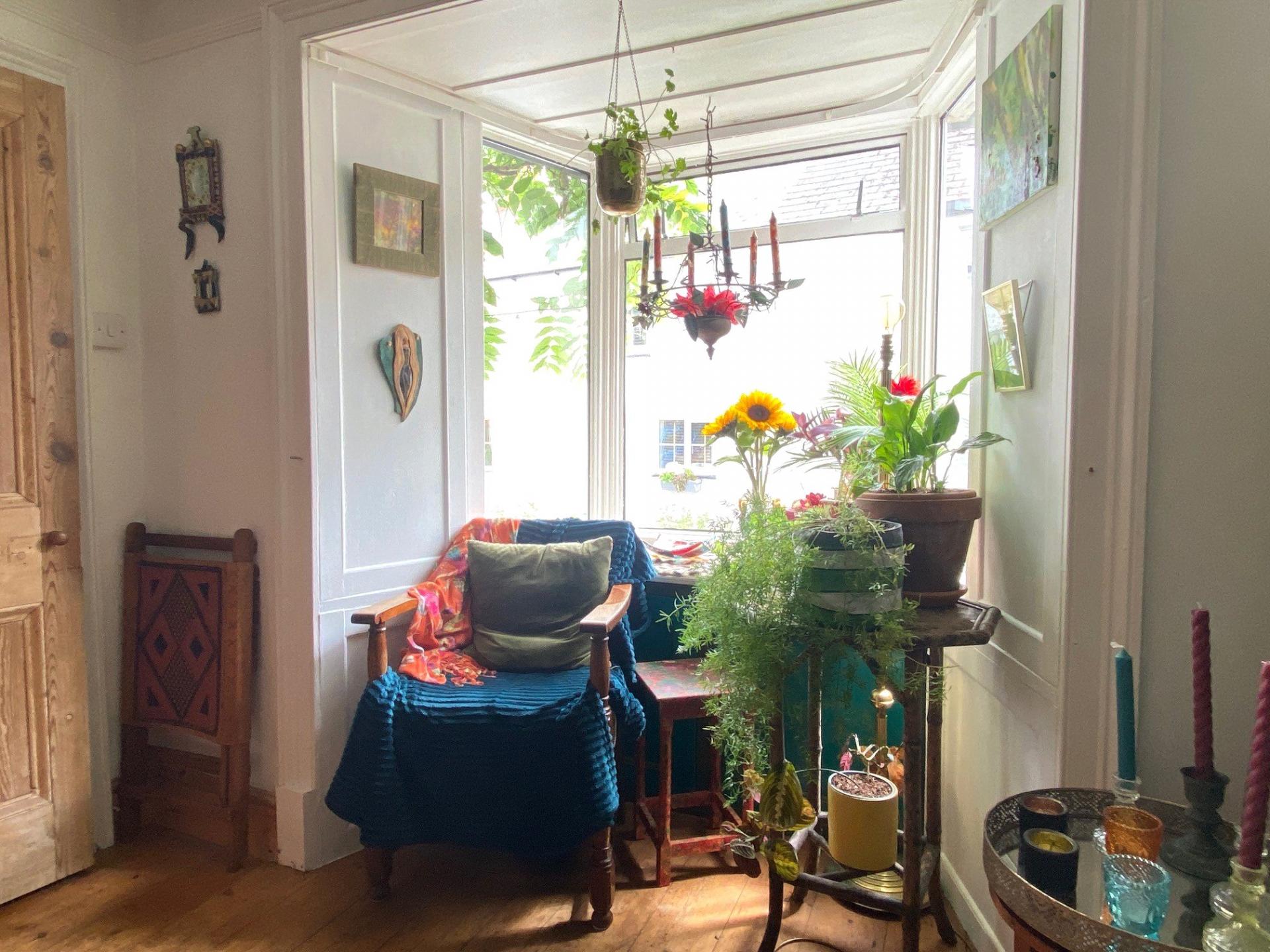 - Lounge with wood-burning stove and bay window