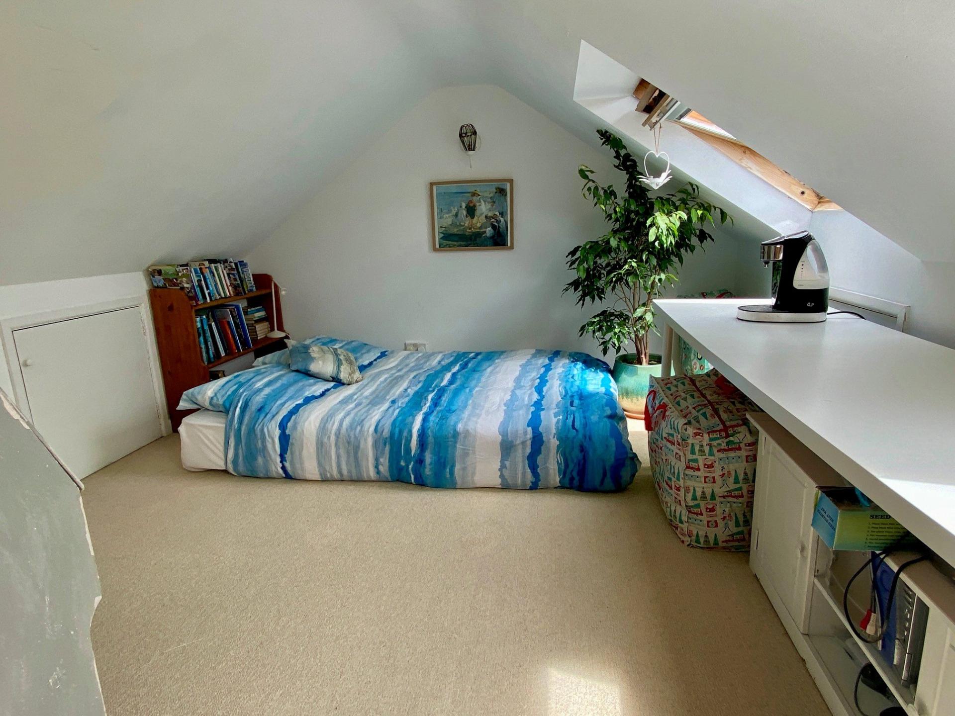- Two second-floor bedrooms with skylights and character features