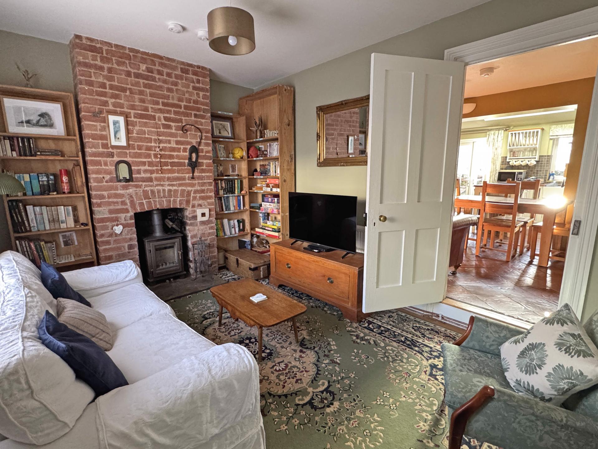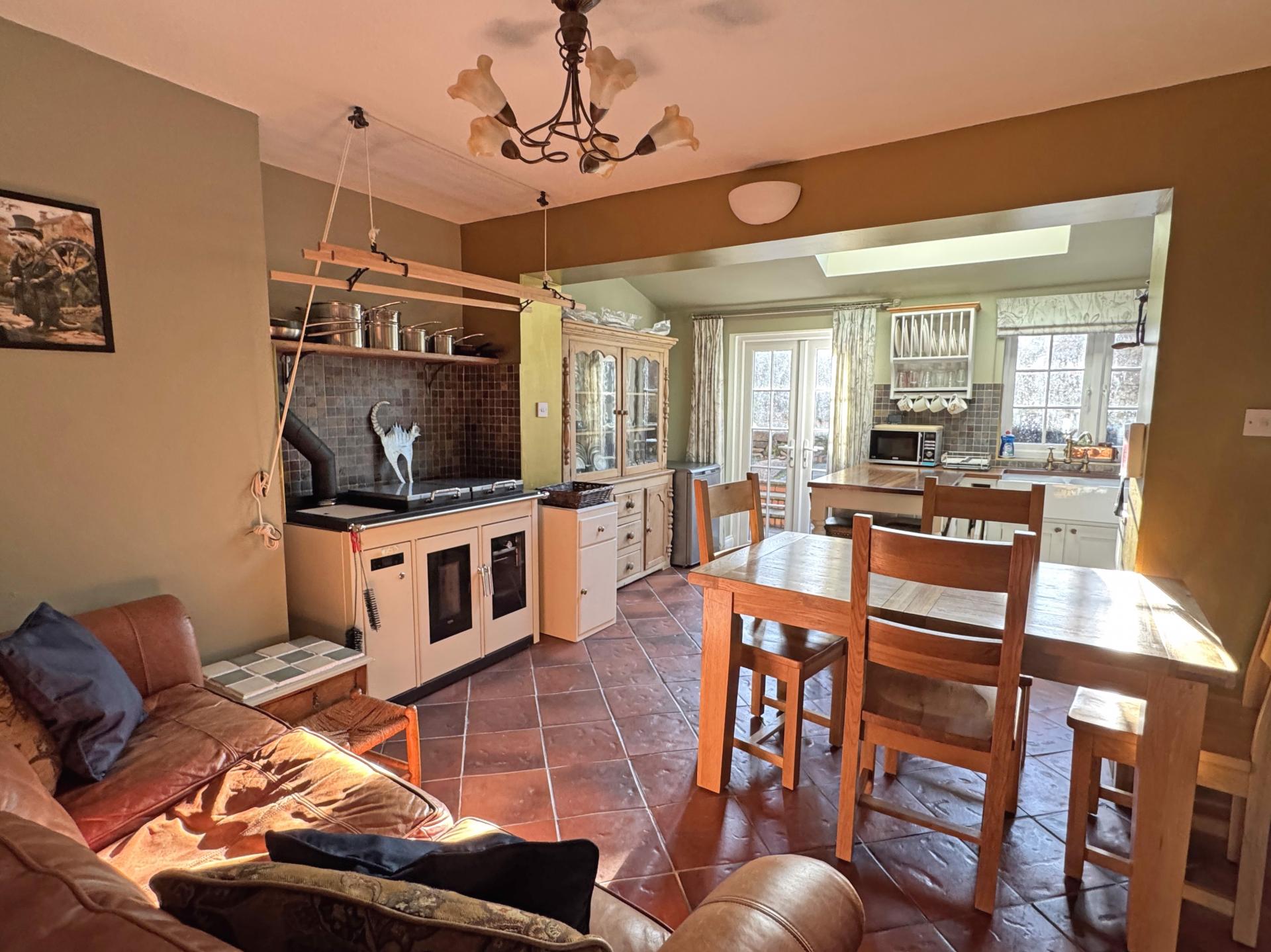 On entering the property, an entrance lobby has stairs rising to the upper floor and access to the sitting room which enjoys an outlook over Fore Street and has a feature brick fireplace with wood burning stove and an understairs storage cupboard. The sitting room opens into a large kitchen/dining/family room which enjoys a lovely southerly aspect and has a partial vaulted ceiling with large roof light and French doors leading into the garden. The kitchen area has a good range of matching hand-made units along with solid wood worksurfaces, Belfast sink and a built-in electric oven and induction hob. There is also a freestanding fridge and freezer along with a fitted wood pellet stove. A useful, adjoining cloaks/WC also houses the hot water cylinder and heating controls.