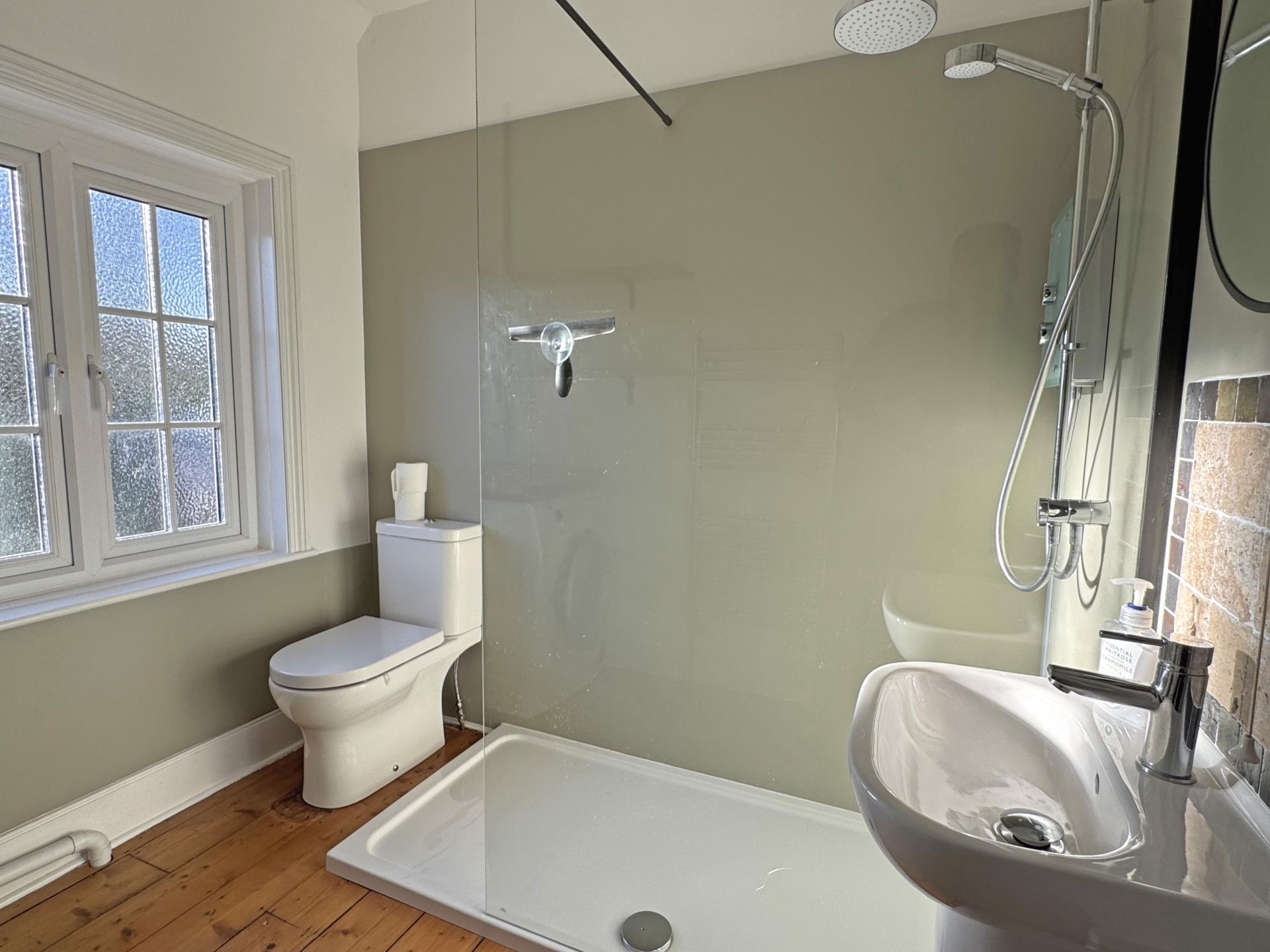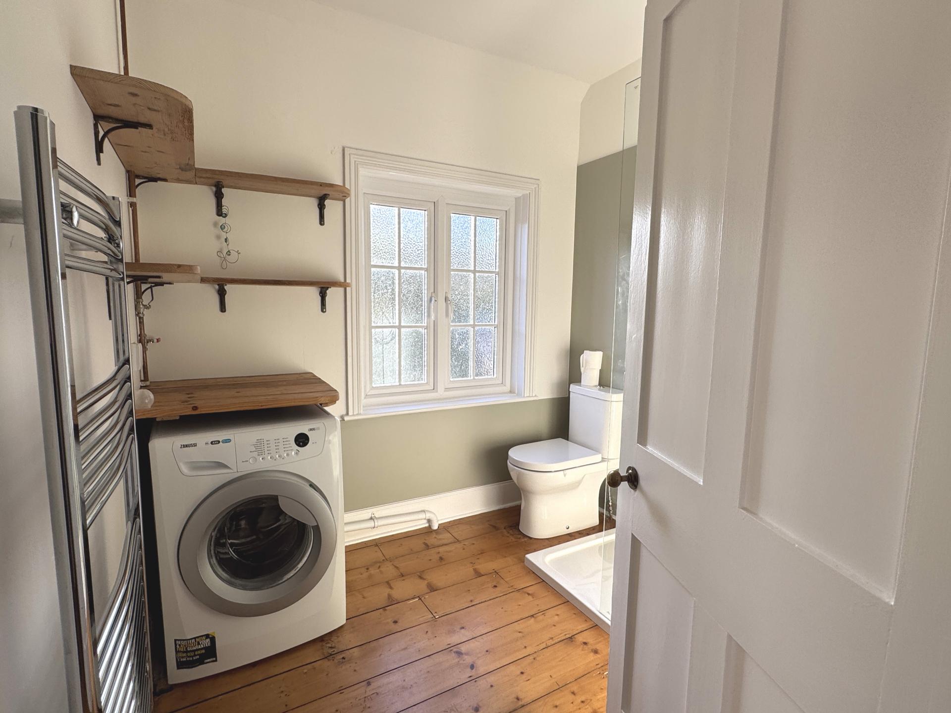 A recently renewed shower room is fitted with a white suite comprising a large walk-in shower, wash basin and WC and also features a chrome heated towel rail and a freestanding washing machine with worksurface over.