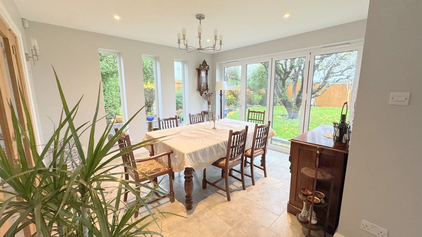 Three large double glazed windows to the side elevation with further double glazed window to the opposite elevation, double glazed door with triple fold sliding doors to the rear patio. Tiled flooring, thermostat for underfloor heating system covering the kitchen and dining areas, wall light points. Two double glazed doors to the rear patio. Open plan leading through to...