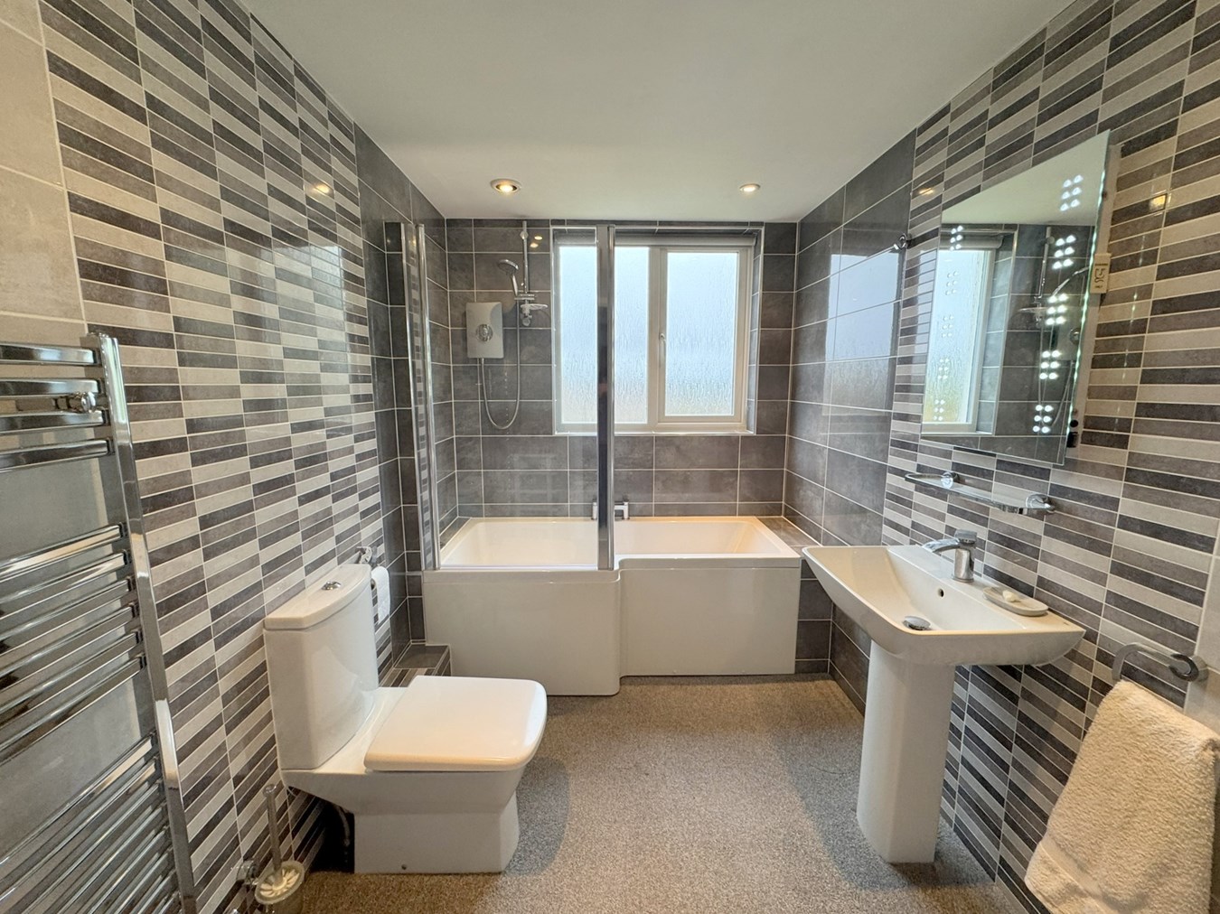 Obscure double glazed window to the rear elevation. Suite comprising panelled bath with glass screen and electric shower over, close coupled WC, pedestal wash hand basin, chrome ladder style heated towel rail, fully tiled walls, ceiling spotlights, extractor fan, wall mounted lit mirror.