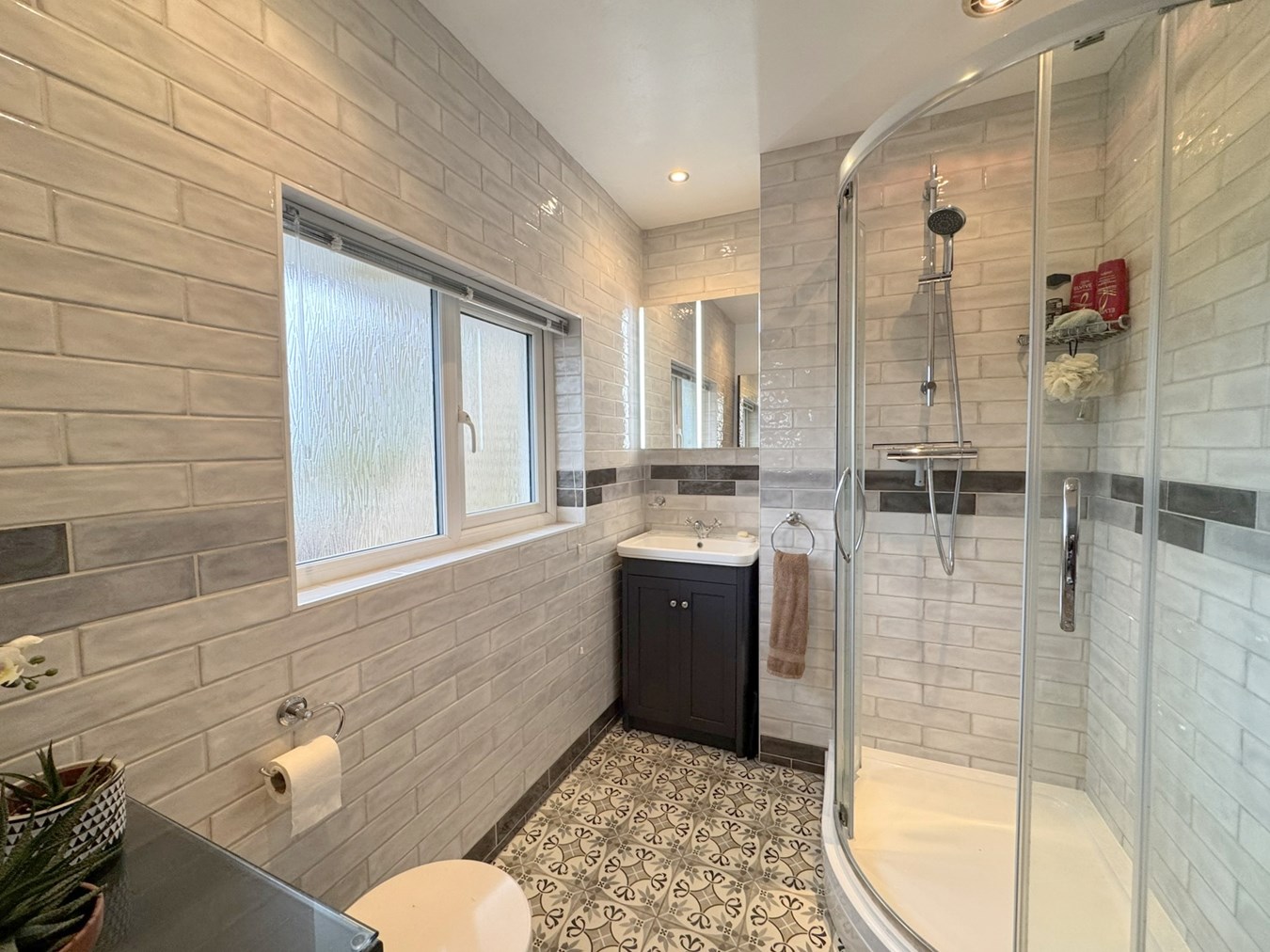 Obscure double glazed window to the rear elevation, corner shower cubicle, WC with concealed cistern, wash hand basin with cupboard under, tiled flooring, extractor fan, ceiling spotlights, chrome ladder heated rail, tiled walls.