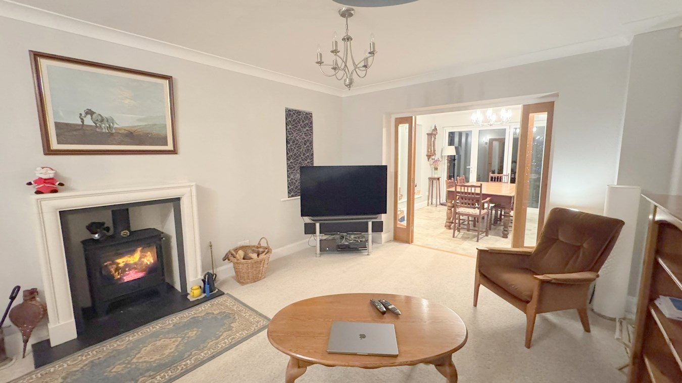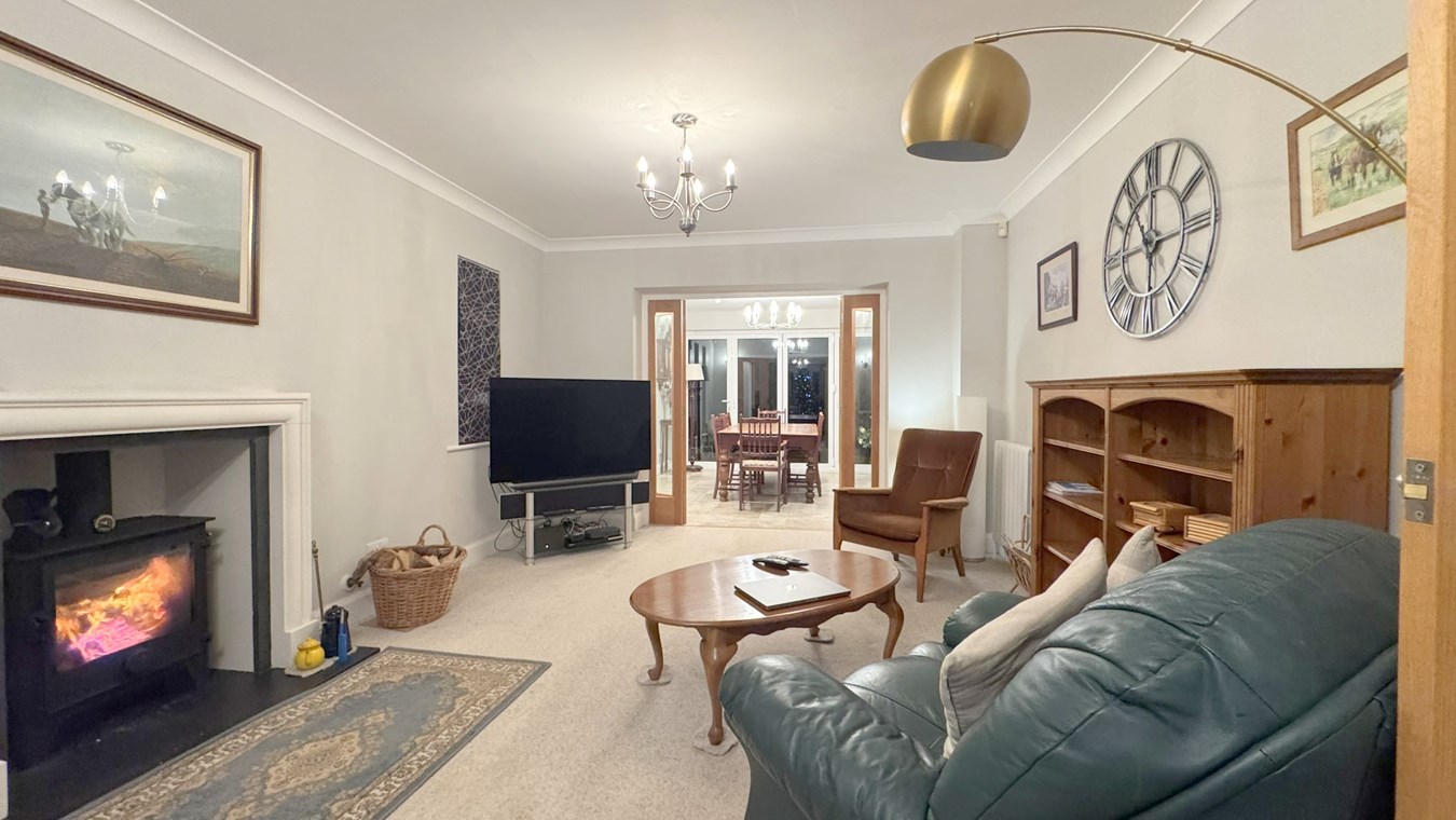Double glazed bay window to the front elevation with two further double glazed windows to the side elevation. Feature fireplace with log burner inset, coved ceiling, TV point, two radiators with thermostatic controls. Double doors leading through to...