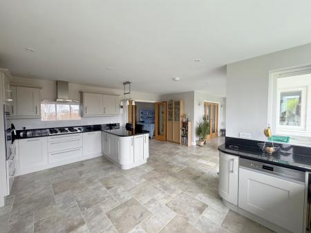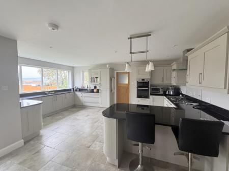 Double glazed window to the rear elevation with two further double glazed windows to either side elevations. Generous expanses of granite work surfaces with inset double stainless steel sink and drainer unit with mixer taps, ample range of base units (including corner pull out tray storage). Ample range of eye level units with under pelmet lighting. Two sets of large saucepan drawers. Matching granite breakfast bar with storage to both sides. Integrated dish washer. Integrated fridge / freezer, double oven, inset five ring gas hob with extractor and light unit over, ceiling spotlights. Door to...
