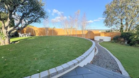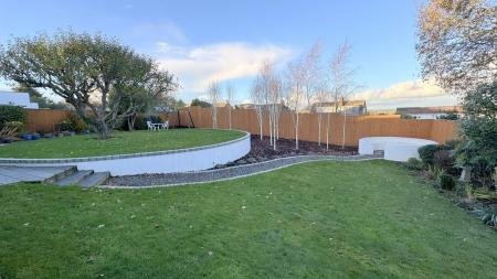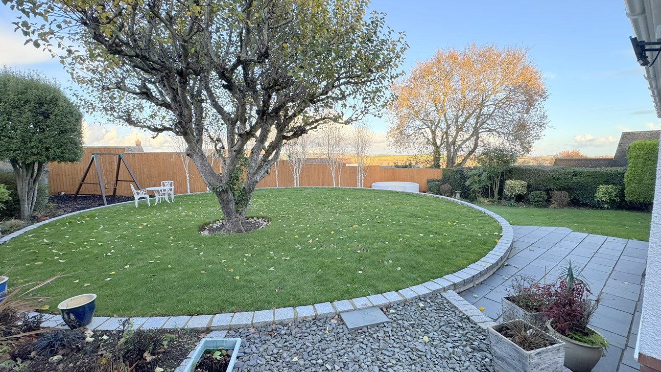 The rear garden a delightful feature of the property, which the design incorporates a slate patio and a raised lawn. The paved terrace enjoys a distant country view plus in the far corner there is a lovely circular designed Mediterranean style seating area. Cold water tap and electric lights.
