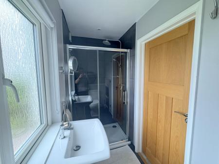 Double glazed window to the rear elevation, shower cubicle, close coupled WC, pedestal wash hand basin, chrome ladder tall handrail, tiled flooring, extractor fan, ceiling spotlights.