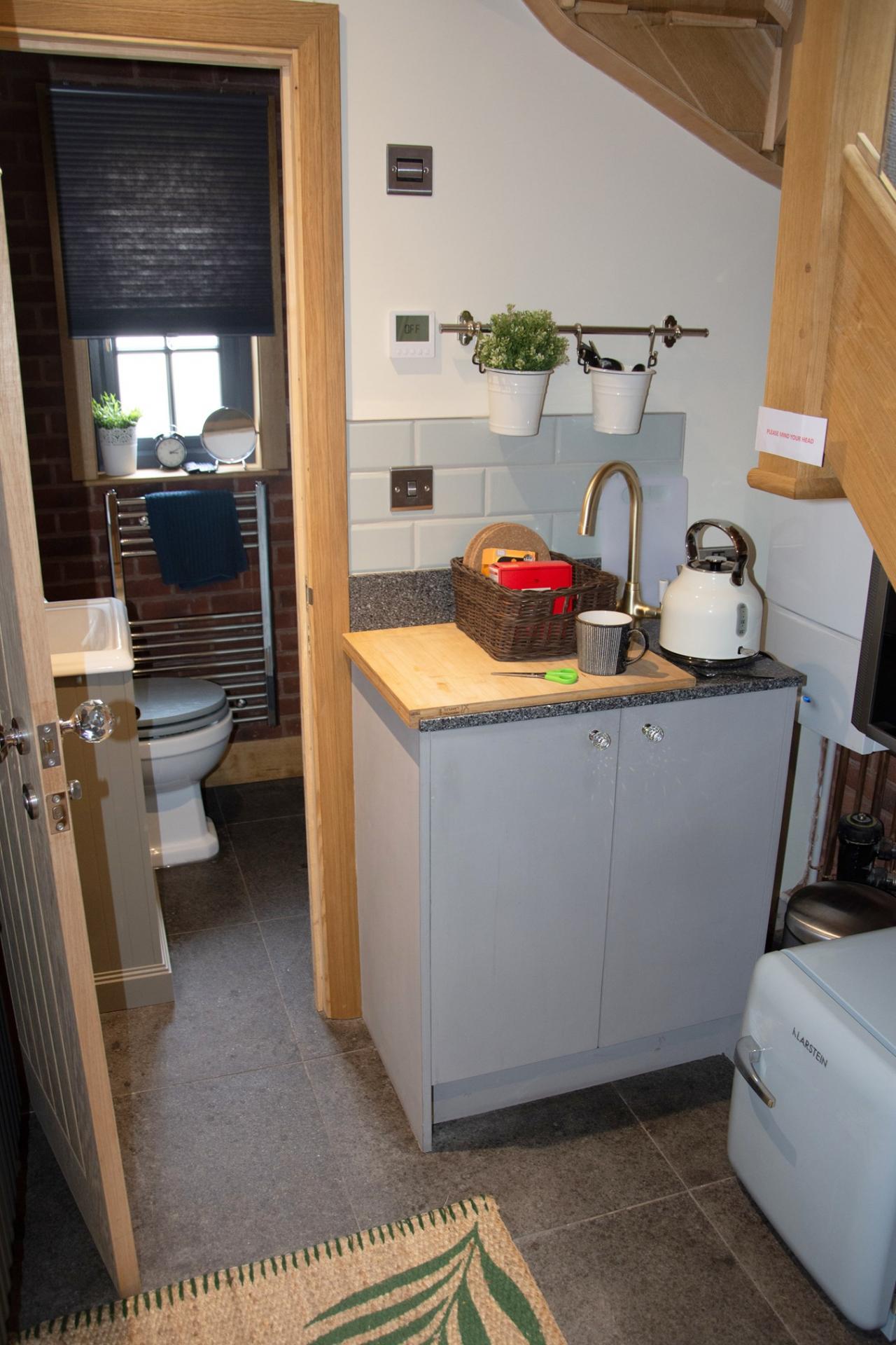 * Kitchenette fitted with a sink, portable hob, Toaster and Kettle and a full sized microwave.