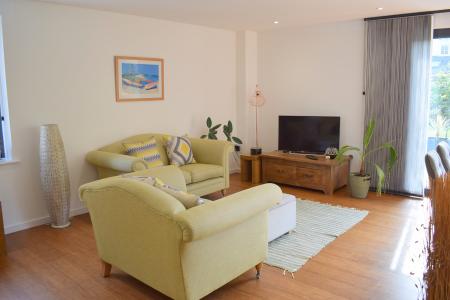 Wood flooring with underfloor heating, thermostat control panel for underfloor heating, spotlights, TV point, recessed shelving area, large feature sliding patio doors out onto the patio area. Telephone point.