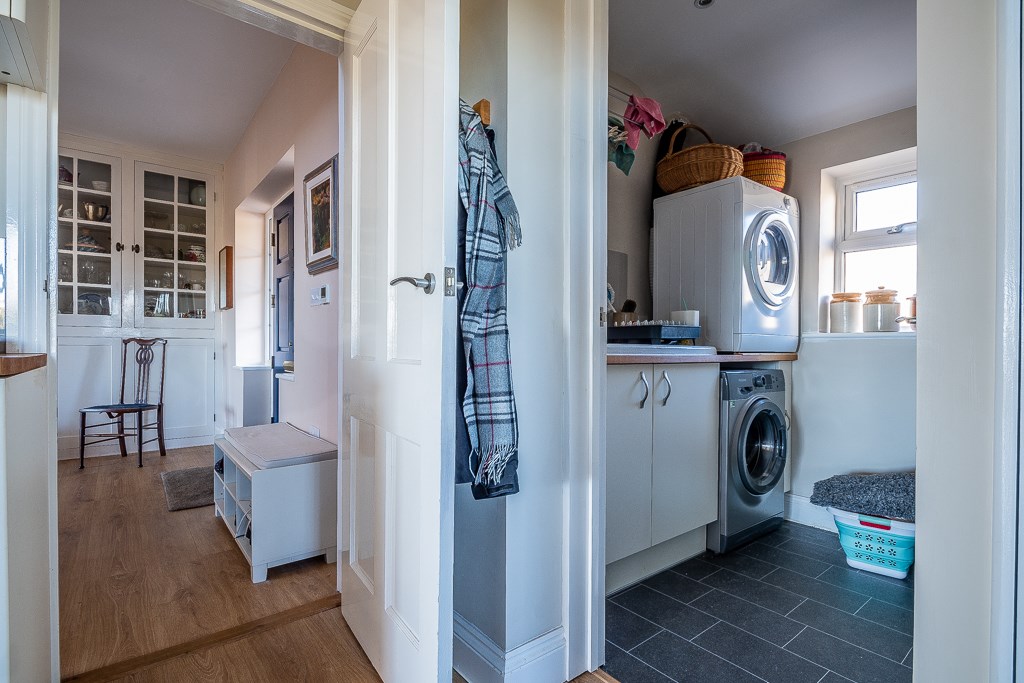 Large porcelain sink and draining board. Deck Mixer Tap. Space for washing machine with dryer above. Multiple cupboards