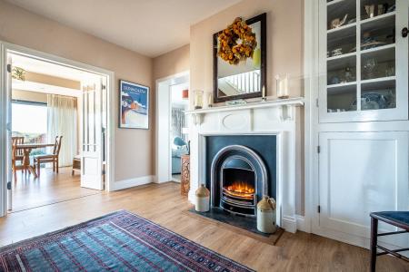 Electric Fire. Chimney could be lined for wood burning stove. Original glass front cupboard contains electricity consumer unit top right. Small cupboard under stairs.