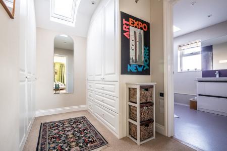 En-Suite Bathroom: Large shower, basin drawers under. 2 wall mounted cupboards. Heated towel rail runs either off central heating or electricity.