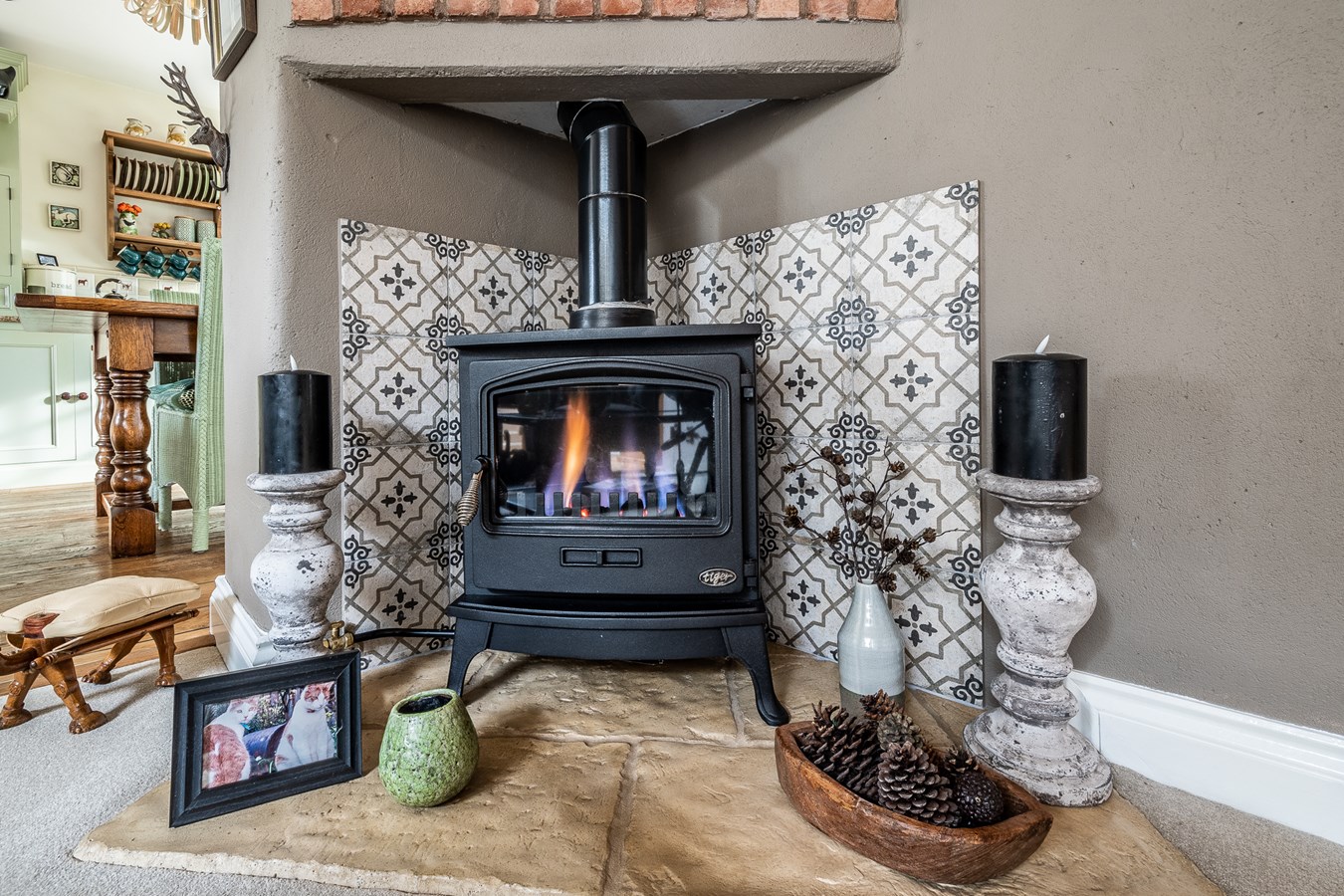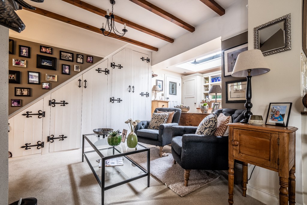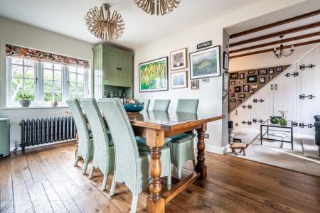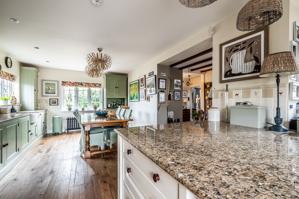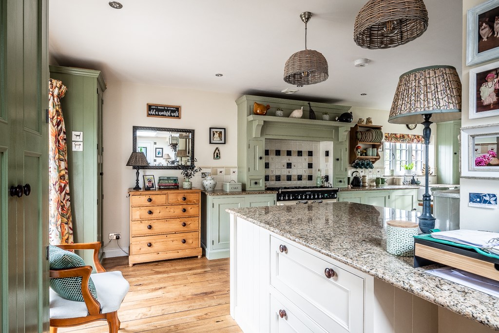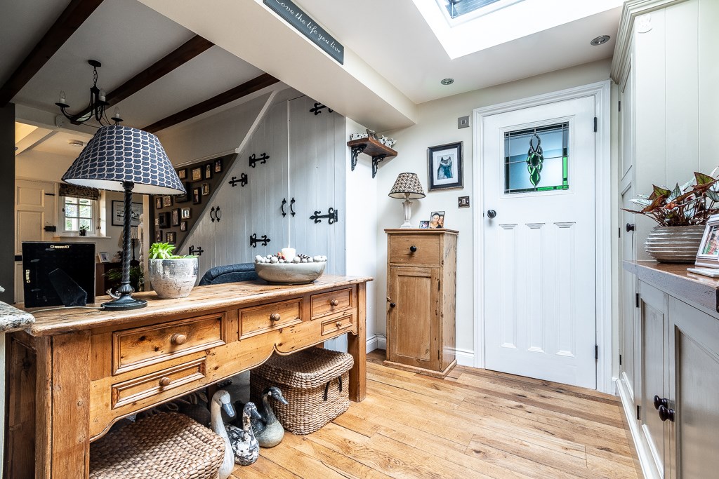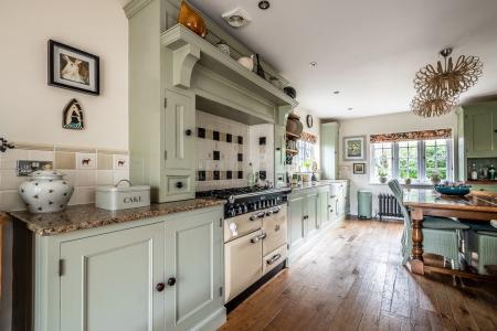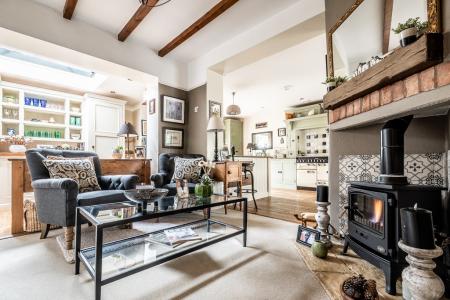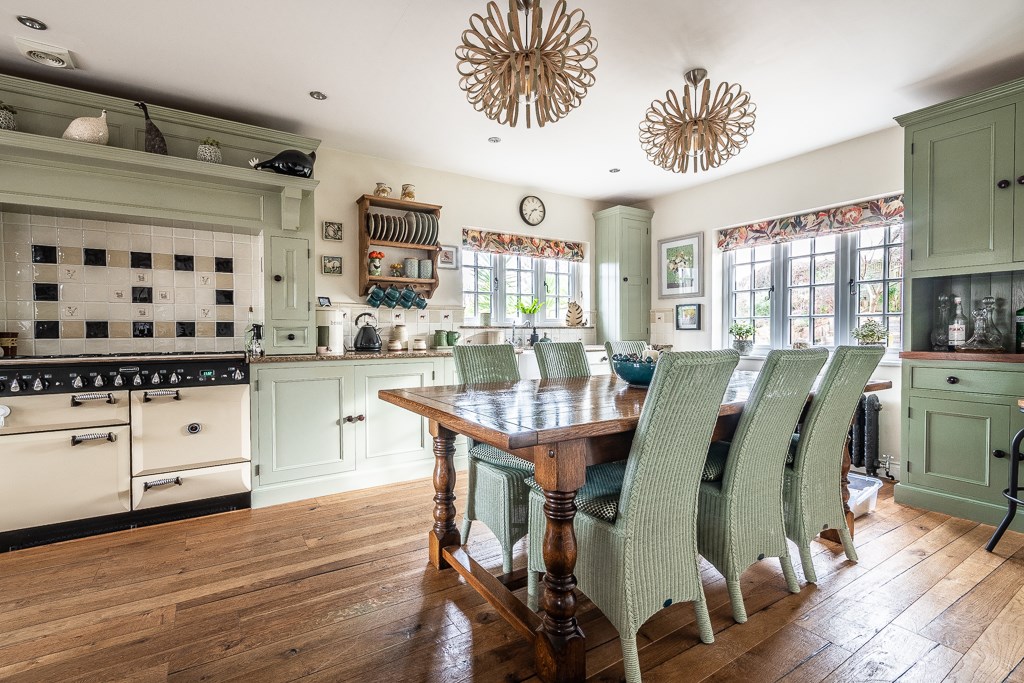 The entrance porch, designed with timeless elegance, leads into a welcoming hallway that connects seamlessly to the snug, offering a warm and inviting retreat. The spacious sitting room is adorned with a central cast iron gas fire, framed by a beautifully crafted mantelpiece, enhancing the room's charm and character. The newly added side wing houses a breathtaking kitchen, finished with bespoke in-frame units painted in a delicate Normandy Grey, paired with luxurious marble worktops and natural wood flooring. A Rangemaster dual-fuel range cooker takes centre stage, complemented by a magnificent wooden surround and a striking tiled splashback. French doors open directly onto the rear garden, allowing an effortless indoor-outdoor flow. Adjacent to the kitchen, the sunlit breakfast room, illuminated by a large skylight, creates a bright and airy ambiance, while a convenient downstairs cloakroom adds practicality to the space.