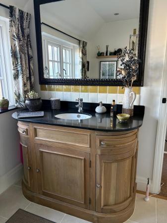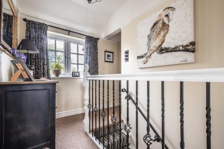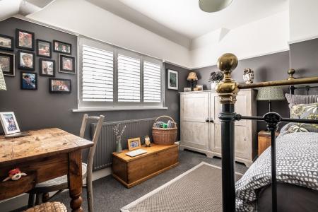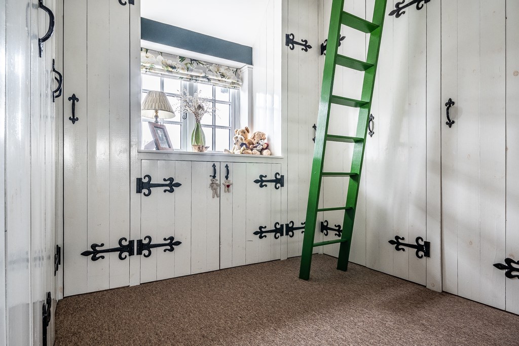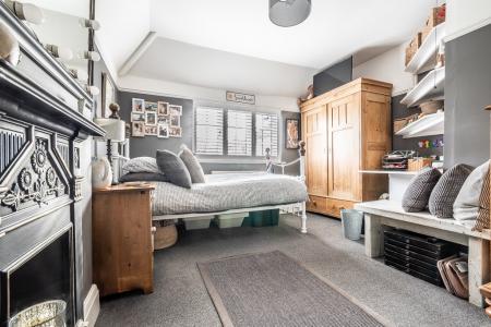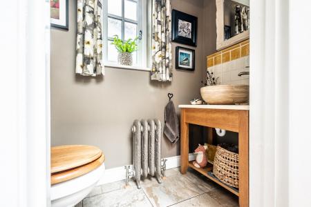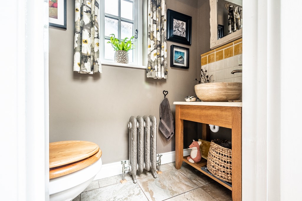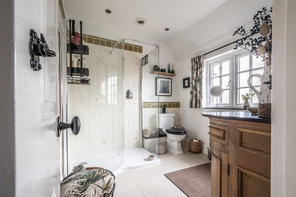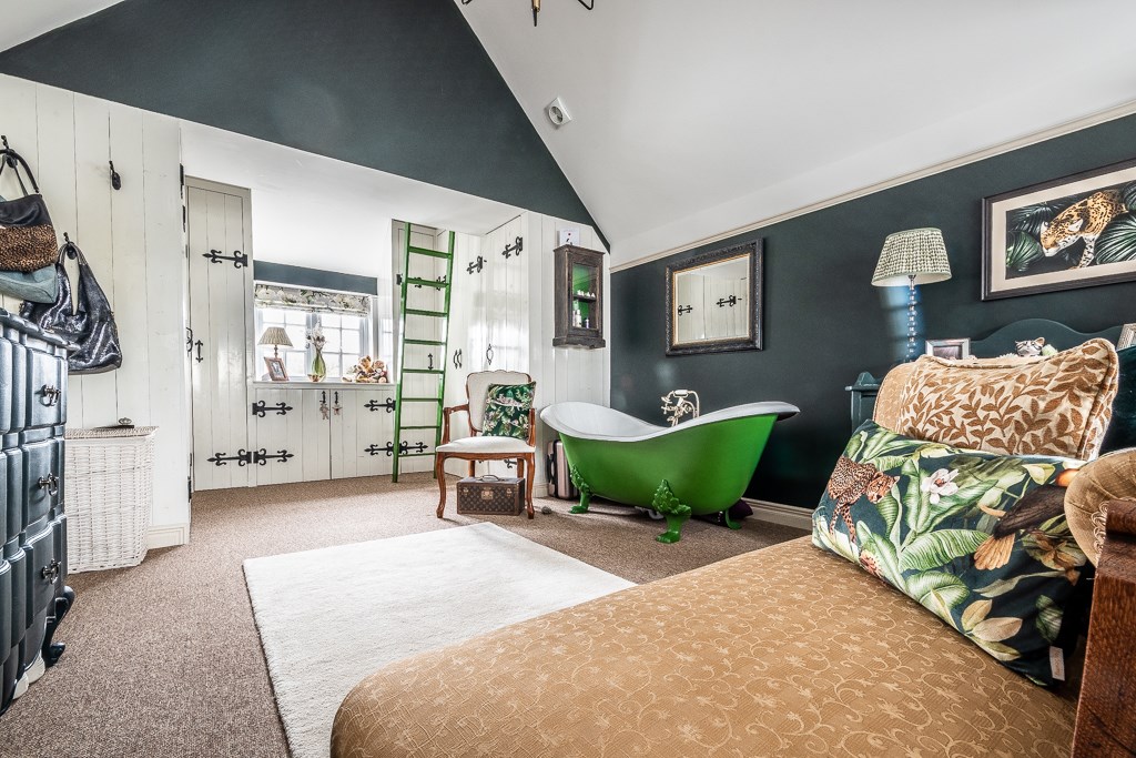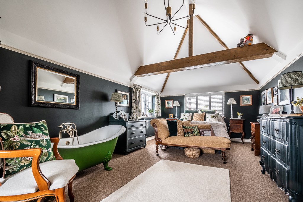 The first floor boasts three beautifully designed bedrooms, including the impressive main suite, which features a vaulted ceiling, an expansive dressing area with abundant wardrobe space, and a luxurious freestanding cast iron roll-top bath. The dressing area could easily be changed into a separate or en-suite bathroom as the plumbing and drainage are already in situ with a window providing ample ventilation. Two further generously sized bedrooms are equally well-appointed, each exuding warmth and charm. The elegant bathroom is completed with a spacious curved walk-in shower and a stylish oak washstand with black quartz worktop and inset basin. The property has been extensively updated, including a full re-roofing and newly installed double glazing throughout, ensuring both comfort and efficiency.