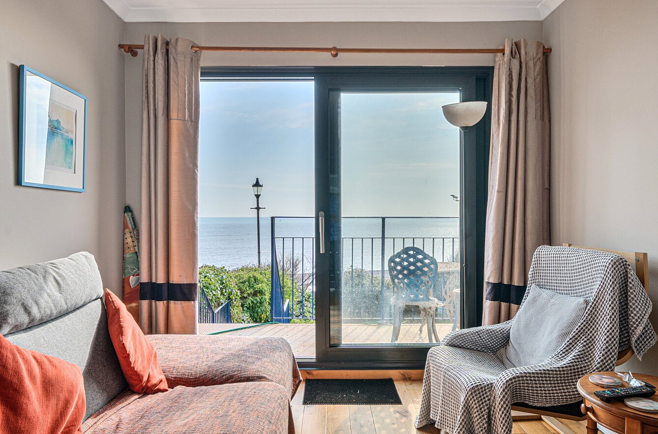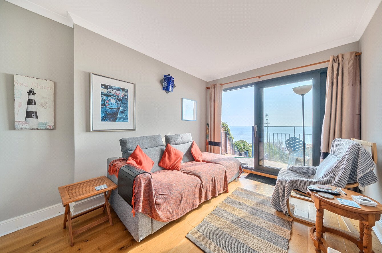 The sitting area benefits from uninterrupted sea views and sliding patio doors that open onto a generous balcony, which steps down to a private, south-facing garden. The garden has a Southerly aspect and is mainly paved, with mature shrubs and borders, and offers direct, gated access to the Southwest Coastal Path.