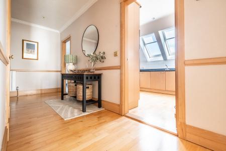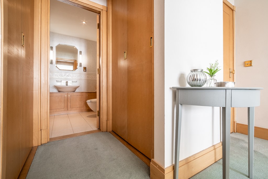 Central heating radiator with thermostatic control, coved ceiling, dado rail, intercom entry phone system, airing cupboard housing a hot water tank with central heating control panel and slatted shelves. Ceiling spotlights and doors to: