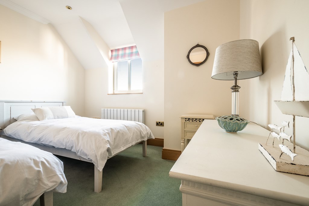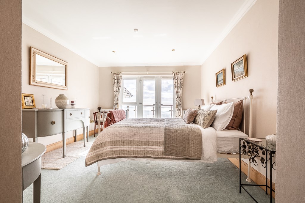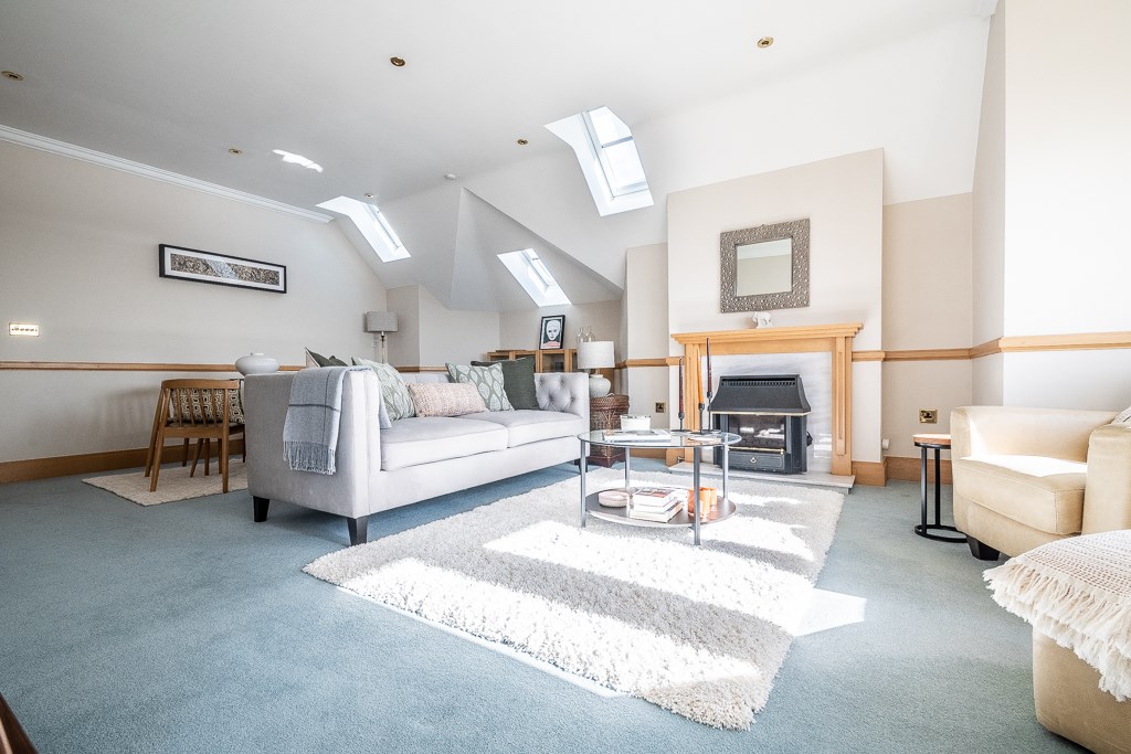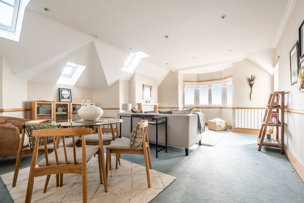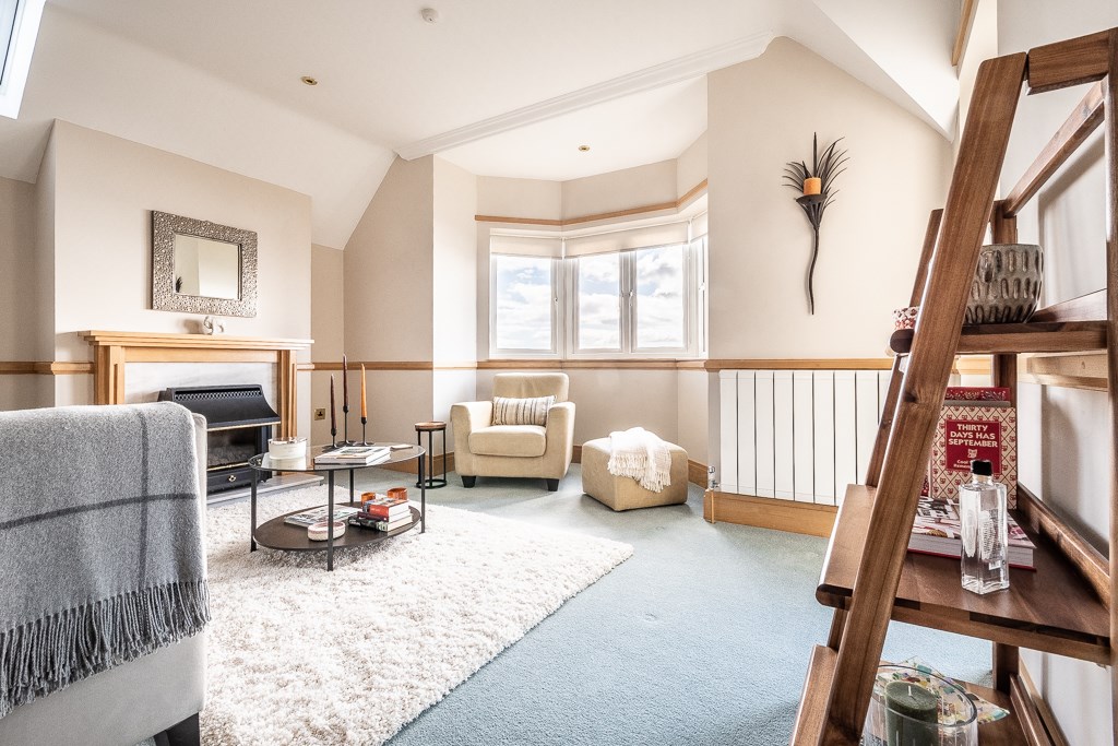 A spacious room with double glazed bay window to the front elevation, further double glazed Velux windows to the side elevation and double glazed door to the side elevation and out onto the balcony. TV point. Television point, two central heating radiators with thermostat controls, dado rail, coved ceiling, feature fireplace with chrome effect fire, marble hearth and surround.