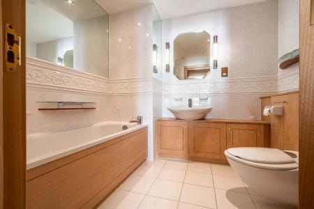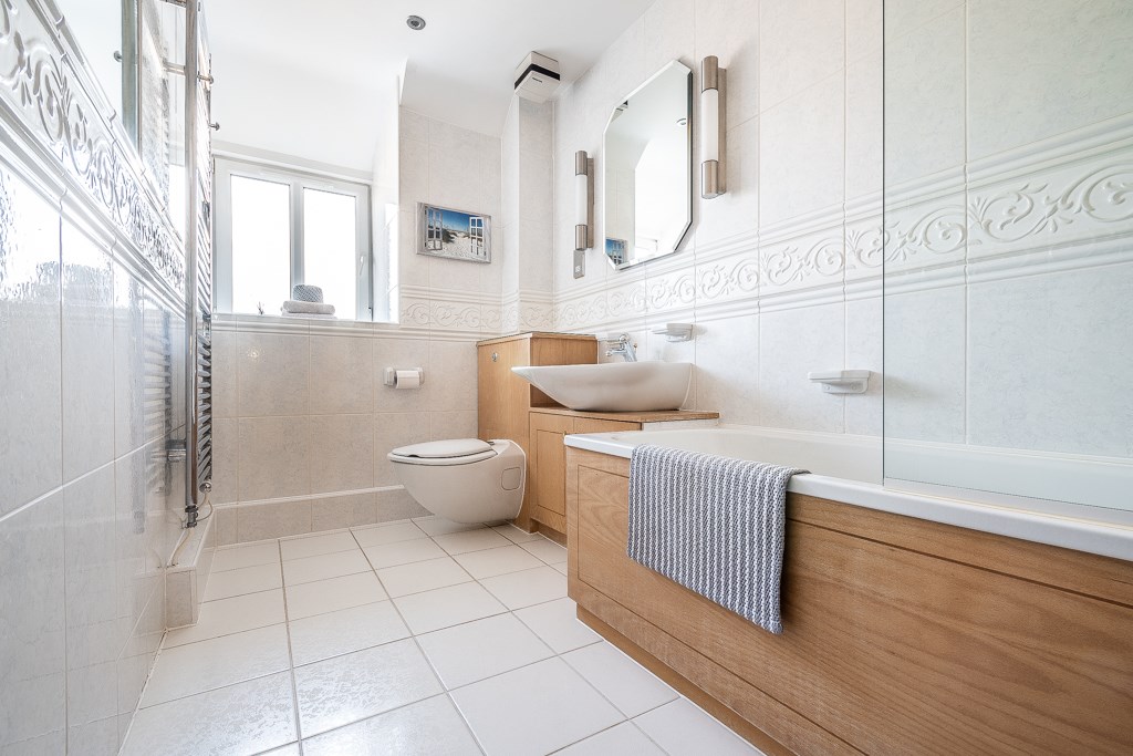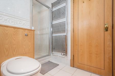 Quality white suite comprising of panelled bath, wash hand basin with cupboard under, close couple WC with concealed cistern, shower cubicle, built-in cupboards, ladder style heated towel rail with thermostat control, fully tiled walls, electric shaver point, extractor fan and tiled flooring.