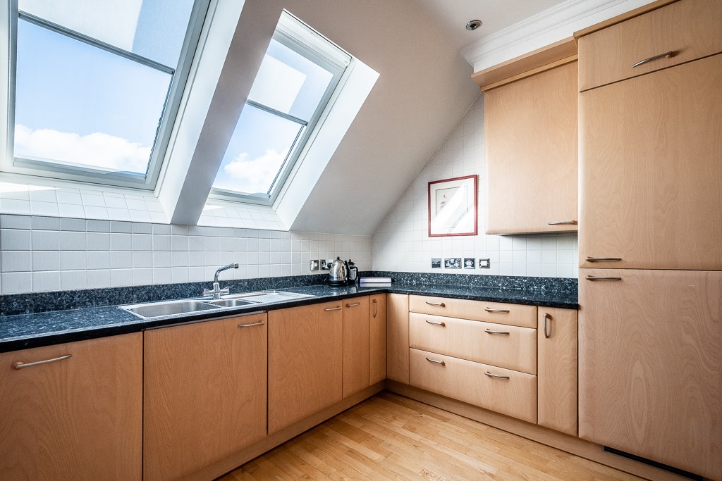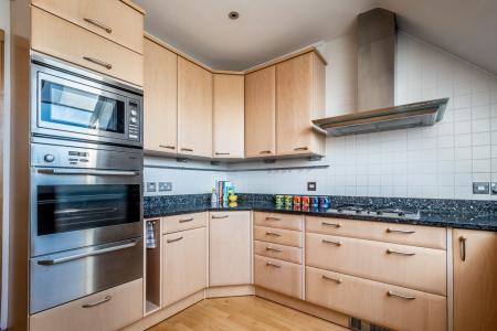 Double glazed Velux windows to the side elevation, generous expanse of marble worktops with inset sink with mixer tap, excellent range of base and eye level storage cupboards, integrated fridge/freezer, integrated dish washer and washer dryer, stainless steel electric double oven with microwave over and inset four ring gas hob with extraction light unit over. Wall mounted gas central heating, tiled splashbacks, ceiling spotlights, television point and electric floor level fan heater.