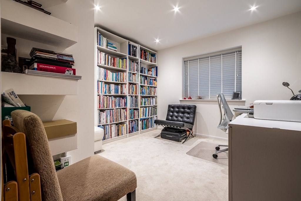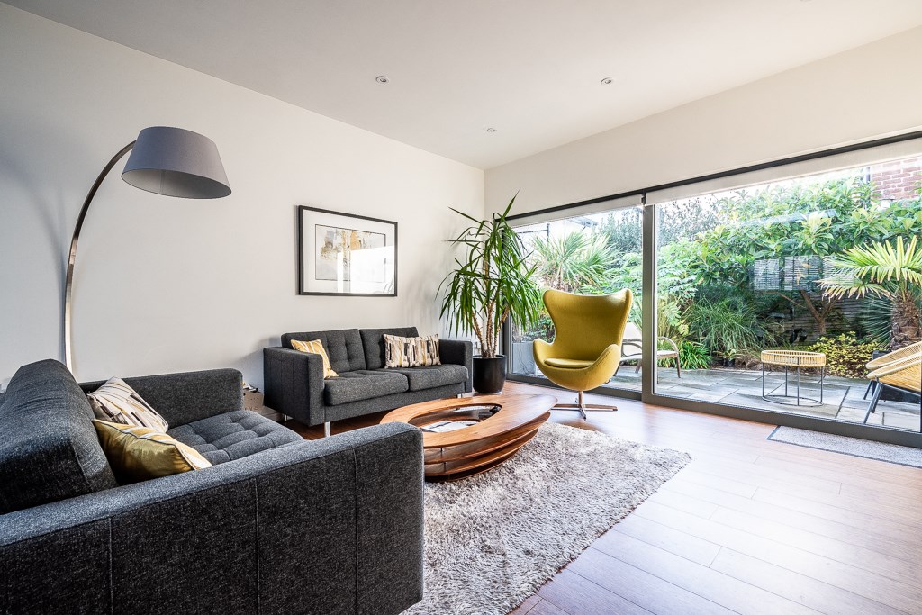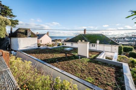 The elevated position enjoys a sunny orientation, whilst the positioning of the rooms affords the correct blend of scenery and privacy. The mature rear garden has an interesting variety of trees and shrubs and a good sized patio for al- fresco entertaining. The green roof design is an Armourplan roofing system with a sedum finish. Private parking for two cars is a rare asset for such a central location. The property was designed by renowned local architect Paul Humphries and built by the high quality builder GD Constructions Ltd.