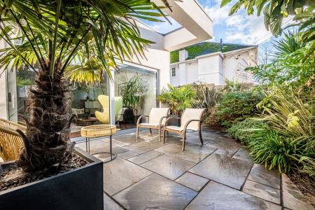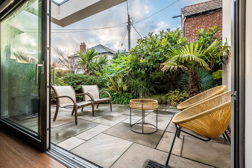 To the front of the property is a brick paved drive with parking for two vehicles and an enclosed front patio. Side access to the left of the property opens to a grey Indian sandstone paved path and patio area with planted borders extending to the rear.