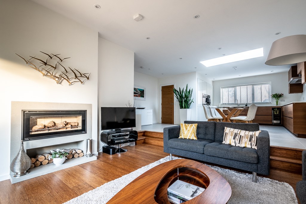 Two steps down into the living area, which has a rear aspect and sliding doors to the patio area. This generous room has a feature Stovax log burner and is finished with engineered bamboo flooring. Off the living area is a utility with space and plumbing for appliances, storage and sink. The master bedroom has a rear aspect, a walk-in wardrobe with fitted shelving and an en suite providing a walk-in shower, wall-mounted wc, basin with storage and a heated towel rail. Bedroom 2 has a front aspect plus fitted wardrobes. Bedroom 3 has a side aspect plus fitted wardrobes. The bathroom is arranged with a bath, wall mounted wc, basin with storage and a heated towel rail.
