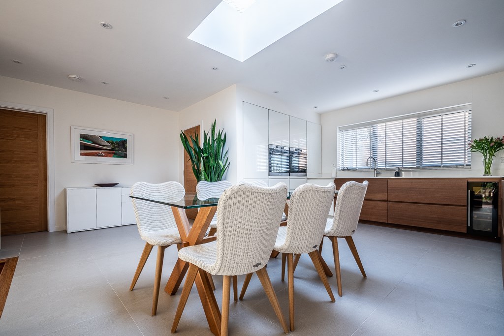 A spacious entrance hall leads through to the impressive open plan living area incorporating the sitting room, kitchen and dining area. The stylish kitchen has a front aspect with distant sea views and an array of matching base and wall units with quartz worktop. The kitchen is fitted with AEG integral appliances which include a ceramic hob, oven & microwave oven, dishwasher, fridge freezer, wine cooler and the addition of a Quooker boil tap, finished with porcelain floor tiles.