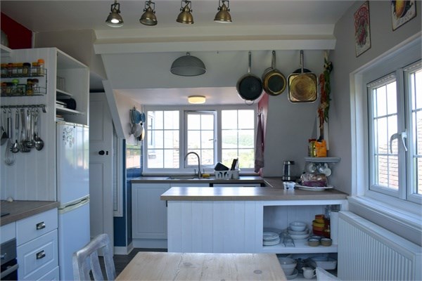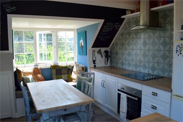 Again, a bright triple aspect room providing superb views. The side window offers distant sea views, the window to the rear overlooks the communal ground with fields beyond. The front aspect window affords distant views along the South Devon coast towards Peak Hill. The kitchen is fitted with a range of units comprising sink unit with mixer tap in roll edge worktop surface with tiled splashback, range of base cupboard and drawer units with matching eye level units over, integrated electric oven, inset four ring ceramic hob with cooker hood over, access to eaves storage, plumbing for washing machine.