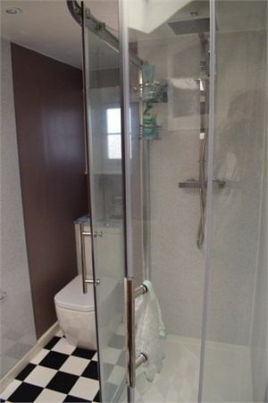 Suite comprises large walk in shower cubicle, pedestal wash hand basin with tiled splash back, close coupled W.C, airing cupboard, wall mounted electric heater, skylight window, further obscured double glazed window.
